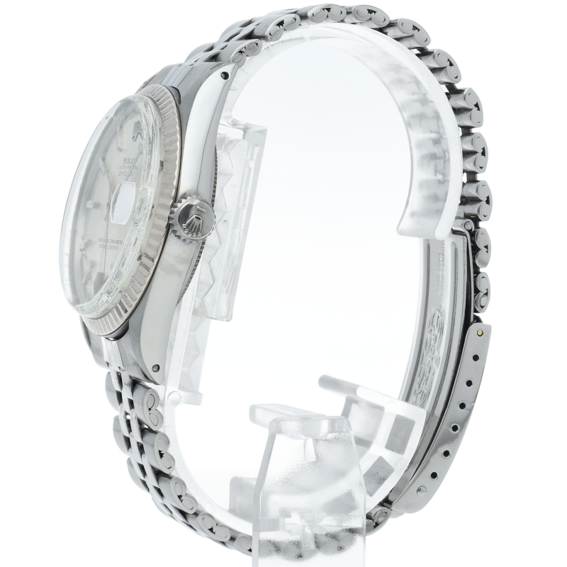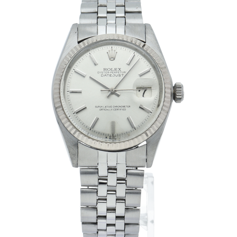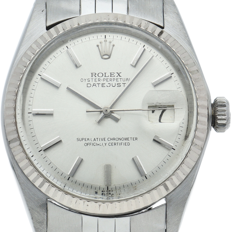 ロレックスのドレスウォッチの王道「デイトジャスト」。ホワイトゴールドとステンレスの組み合わせが高級感を感じさせる1本です。プラスチック風防仕様。