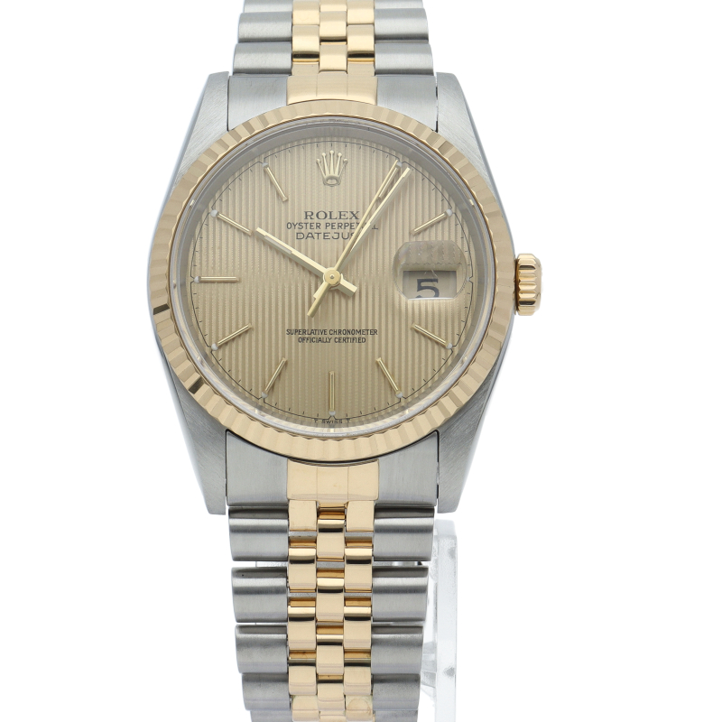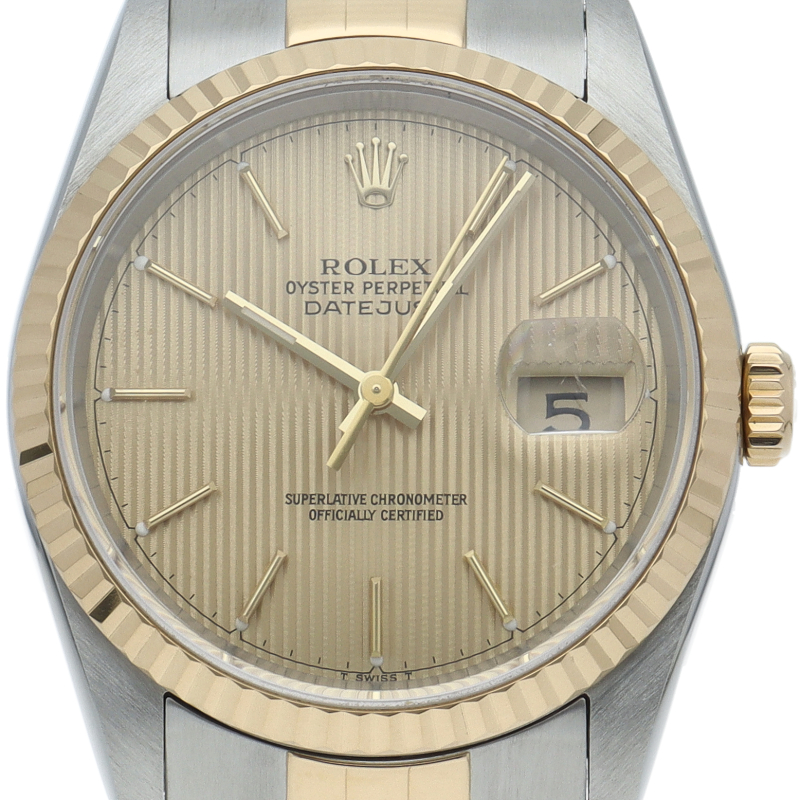 ロレックスのドレスウォッチの王道「デイトジャスト」。イエローゴールドとステンレスの組み合わせが上品で高級感を感じさせる1本です。