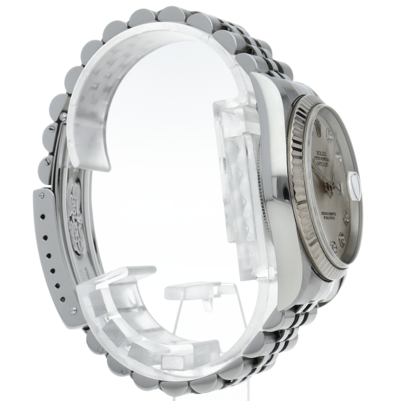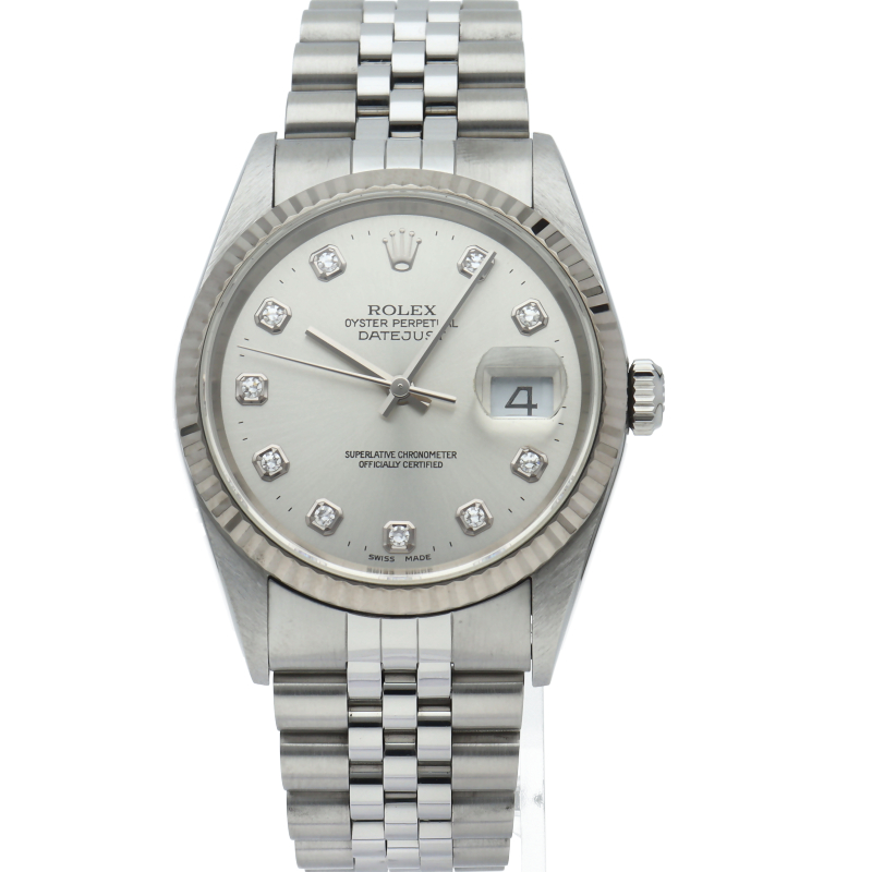 ロレックスのドレスウォッチで幅広い年齢層に愛されている「デイトジャスト」。ホワイトゴールドとステンレスのコンビ仕様に10Pダイヤが施されております。