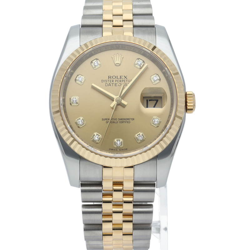 ロレックスの象徴「デイトジャスト」Ref.116233G。イエローゴールドのコンビケースに、10粒のダイヤモンドを配したラグジュアリーな仕様です。ブレスレットの堅牢性やケースのボリュームが増したことで、旧型以上の高級感を実現。普遍的なデザインに宝石の輝きが華を添える、ステータス性抜群のエレガントな一本です。