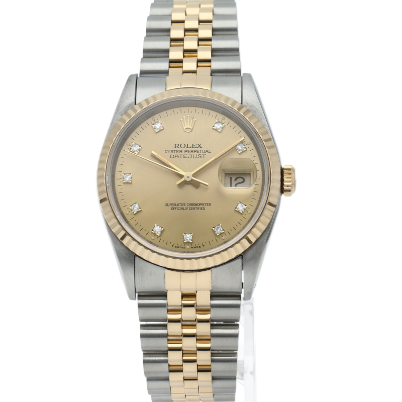 ロレックスのドレスウォッチの王道「デイトジャスト」。イエローゴールドとステンレスの組み合わせが上品で高級感を感じさせる1本です。