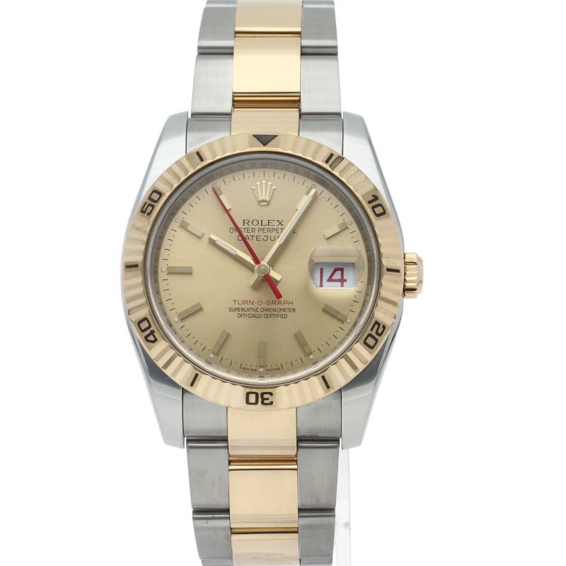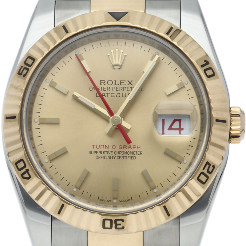 サンダーバードの後継機として誕生した「ターノグラフ」はケースやバックル等が仕様変更され高級感溢れる1本です。イエローゴールド製のベゼルが特徴です。