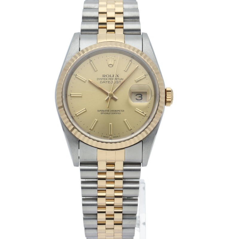 ロレックスのドレスウォッチの王道「デイトジャスト」。イエローゴールドとステンレスの組み合わせが上品で高級感を感じさせる1本です。