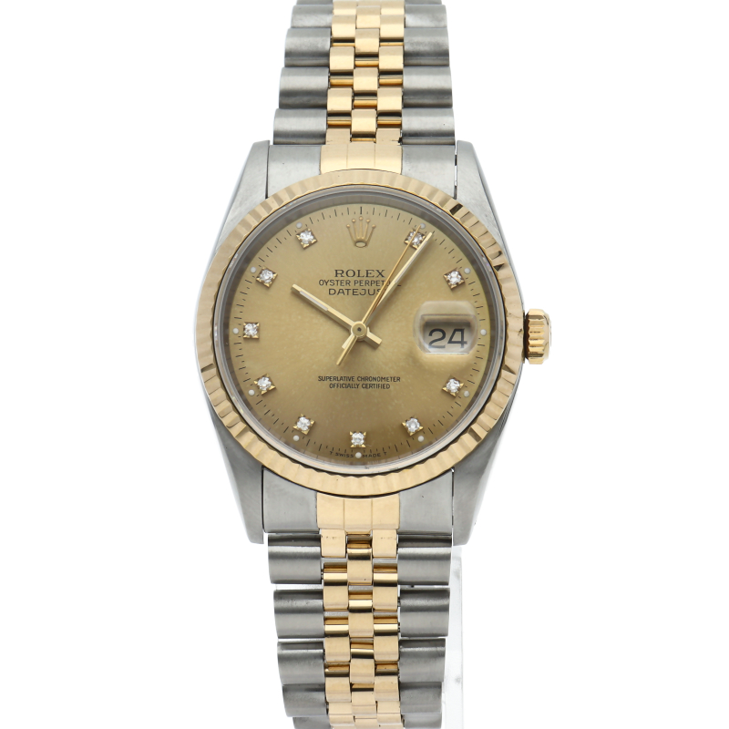 ロレックスのドレスウォッチの王道「デイトジャスト」。イエローゴールドとステンレスの組み合わせが上品で高級感を感じさせる1本です。