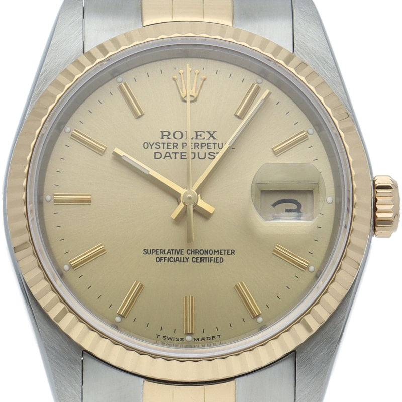 ロレックスのドレスウォッチの王道「デイトジャスト」。イエローゴールドとステンレスの組み合わせが上品で高級感を感じさせる1本です。