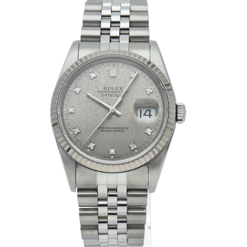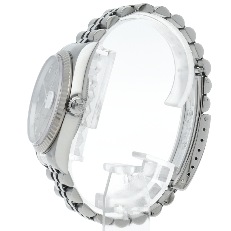 ロレックスの王道「デイトジャスト」Ref.16234G。18Kホワイトゴールドベゼルの鋭い輝きに加え、インデックスに10粒のダイヤモンドを配したラグジュアリーな仕様です。名機Cal.3135を搭載し実用性も抜群。完成されたデザインは色褪せず、腕元に知的なステータスを与える永遠のロングセラーモデルです。