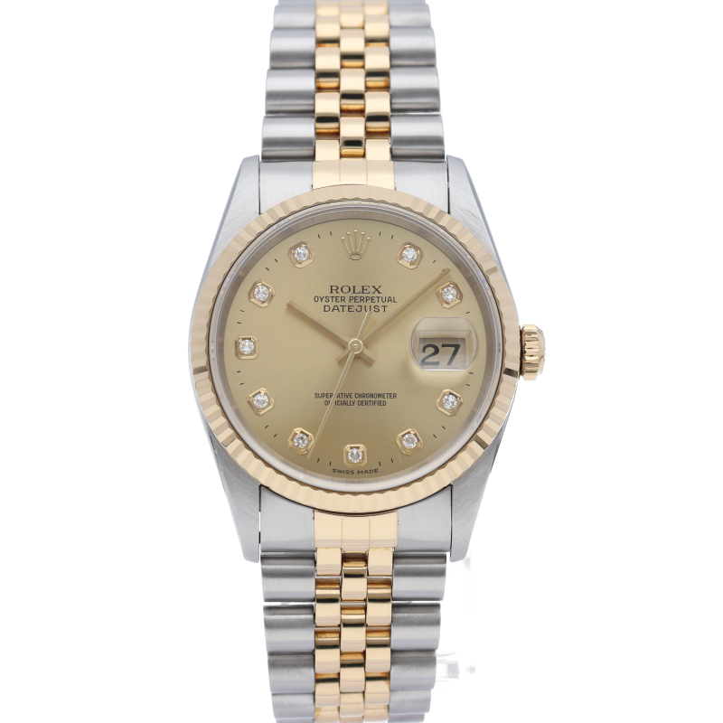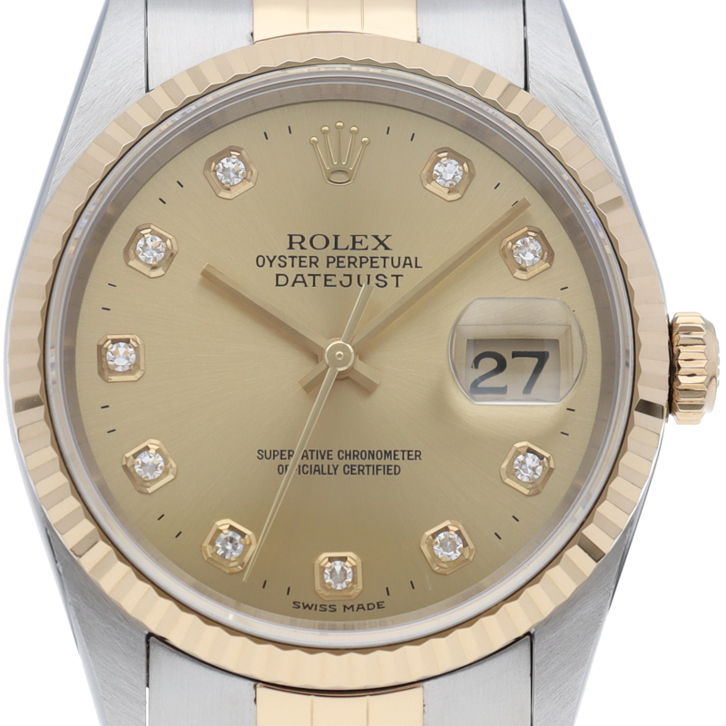ロレックスのドレスウォッチの王道「デイトジャスト」。イエローゴールドとステンレスの組み合わせが上品で高級感を感じさせる1本です。