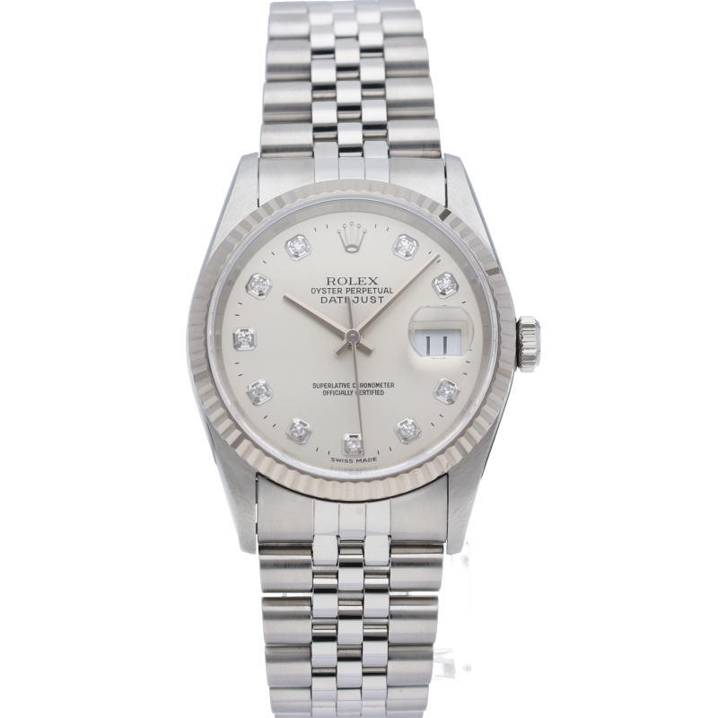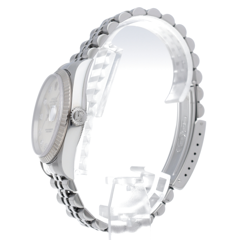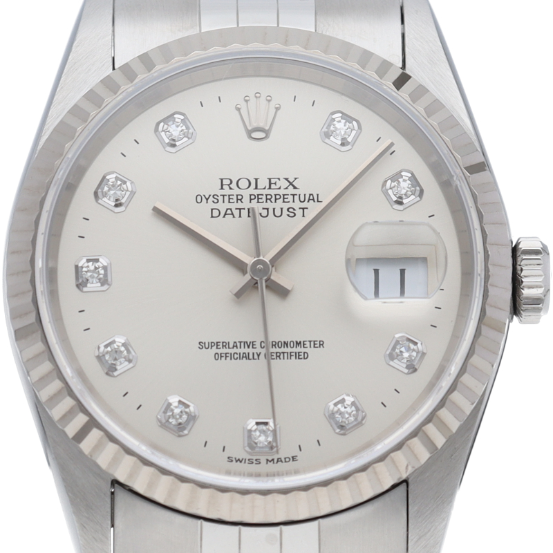 ロレックスのドレスウォッチで幅広い年齢層に愛されている「デイトジャスト」。ホワイトゴールドとステンレスのコンビ仕様に10Pダイヤが施されております。