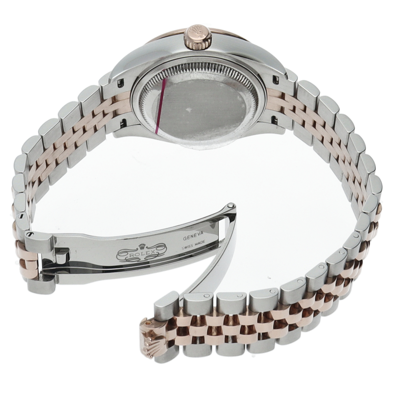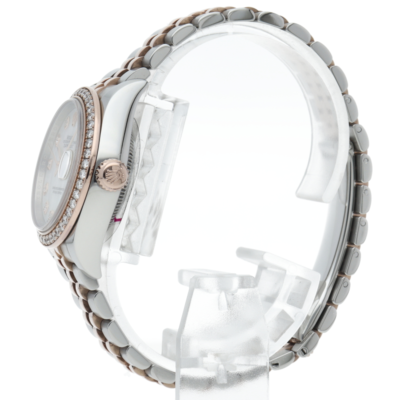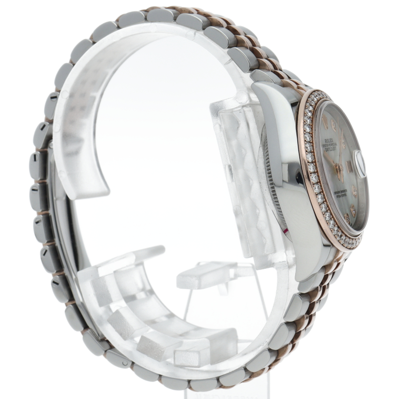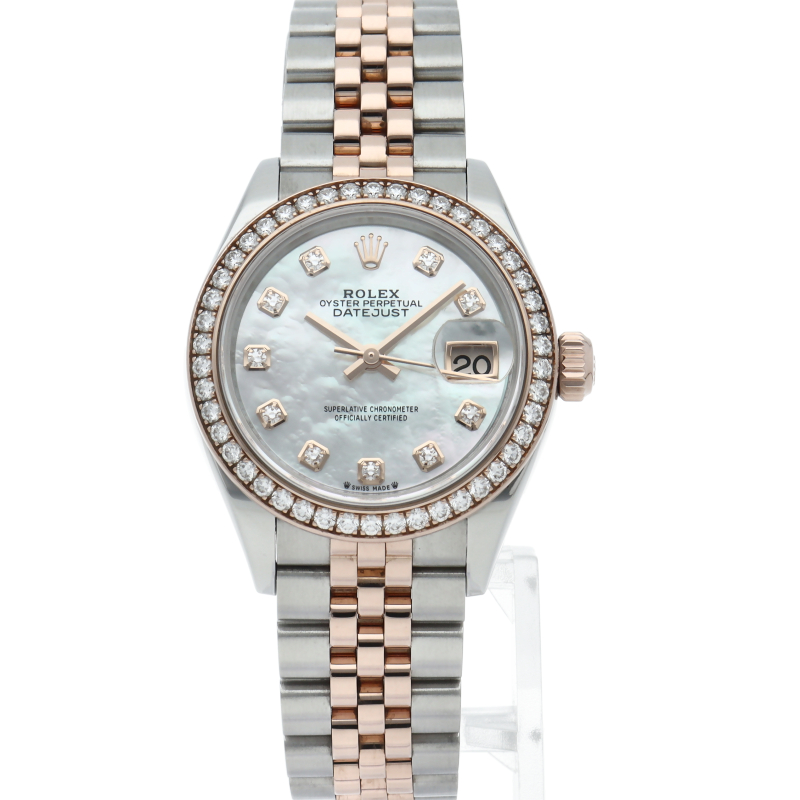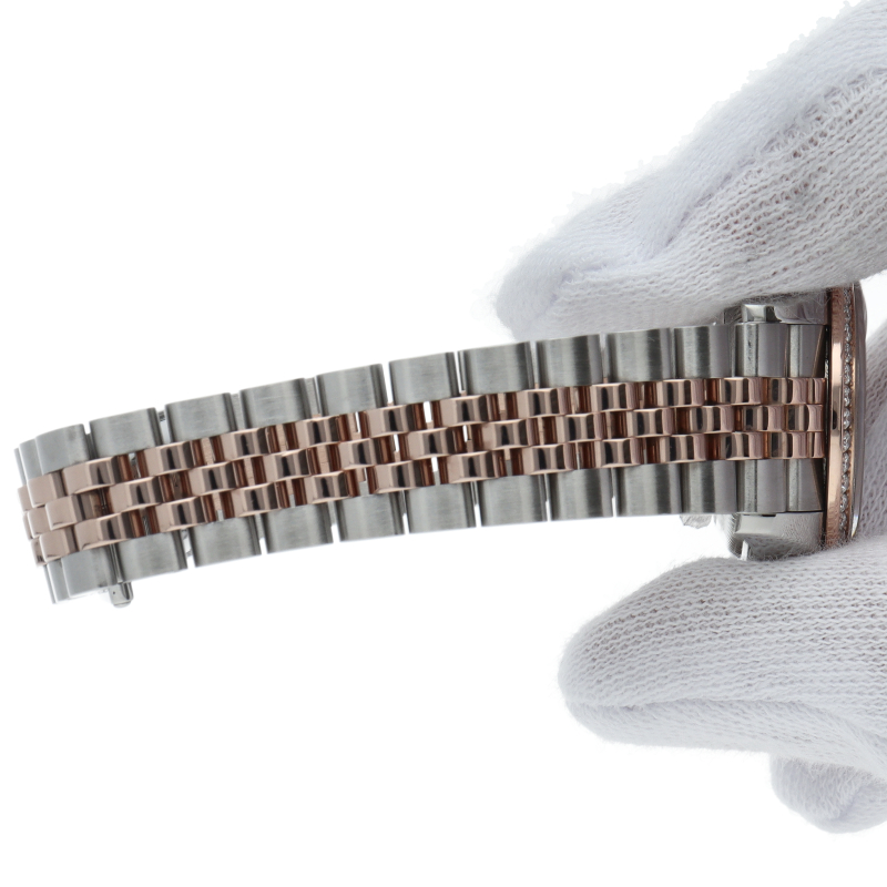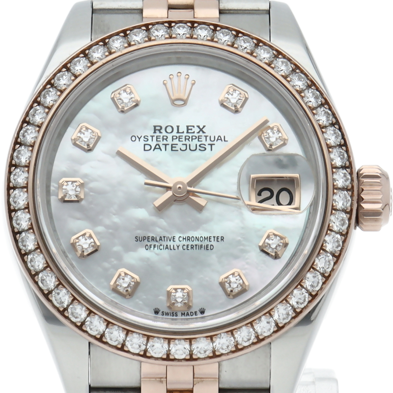レディース・ロレックスの定番モデルとも言える「デイトジャスト」。こちらはスチールとエバーローズゴールドのコンビモデルで、ベゼルにセッティングされたダイヤモンドの煌きが美しいモデルです。ロレックスが特許を取得したシリコン製シロシキ・ヘアスプリングを備えたCal.2236を搭載。パワーリザーブは約55時間です。