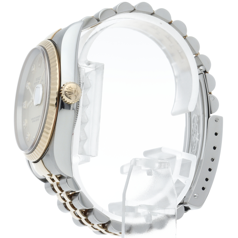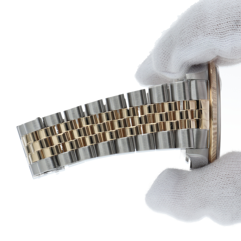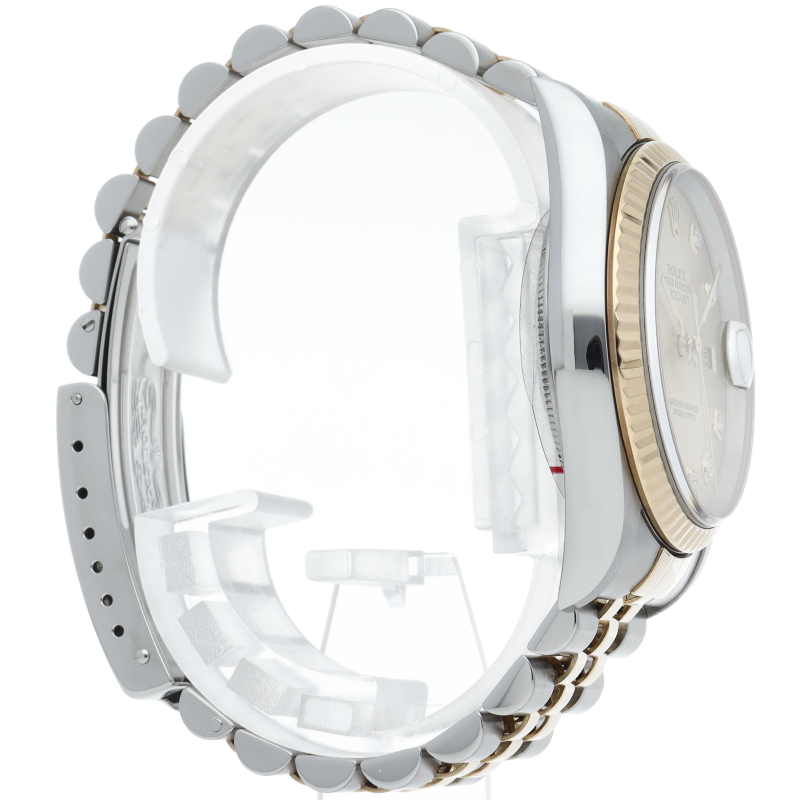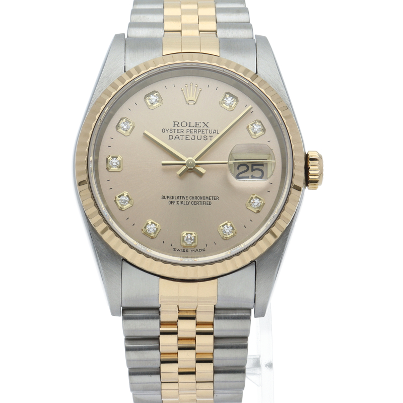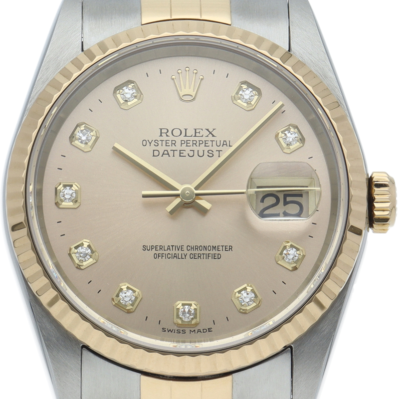 ロレックスのドレスウォッチで幅広い年齢層に愛されている「デイトジャスト」。イエローゴールドとステンレスのコンビ仕様に10Pダイヤが施されております。