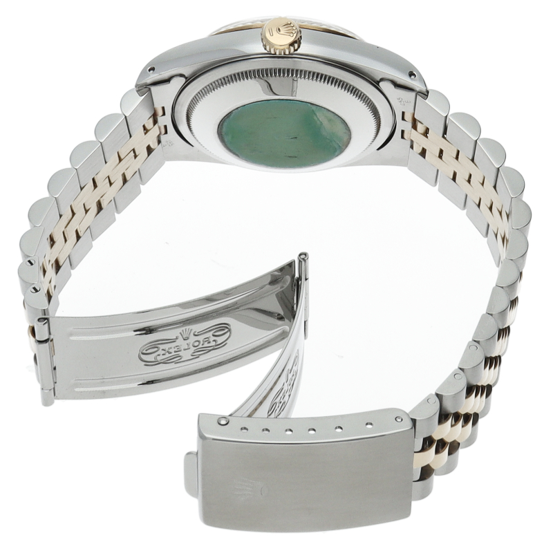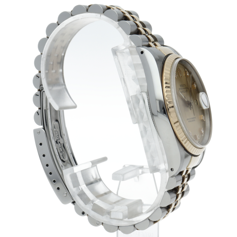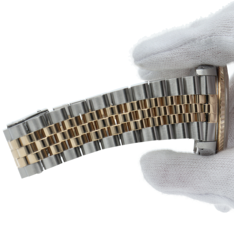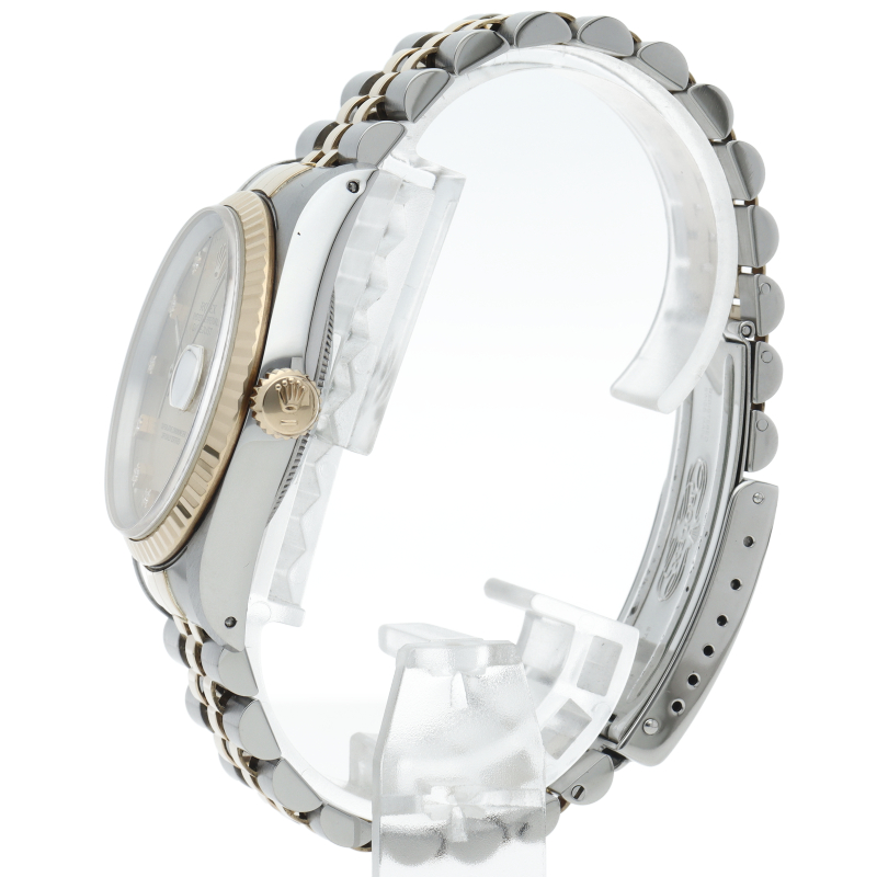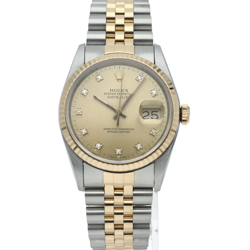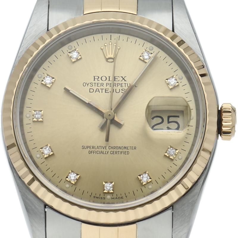 ロレックスのドレスウォッチで幅広い年齢層に愛されている「デイトジャスト」。イエローゴールドとステンレスのコンビ仕様に10Pダイヤが施されております。