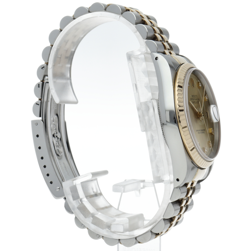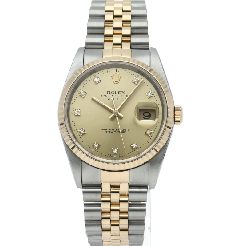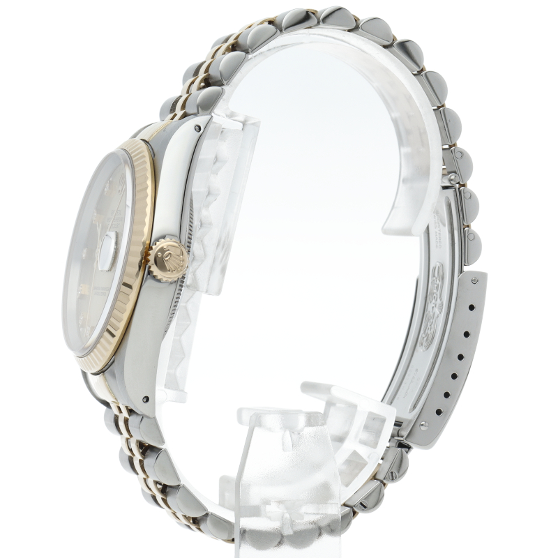 ロレックスのドレスウォッチで幅広い年齢層に愛されている「デイトジャスト」。イエローゴールドとステンレスのコンビ仕様に10Pダイヤが施されております。