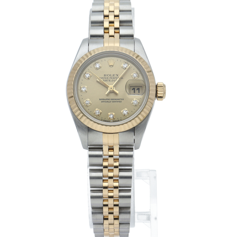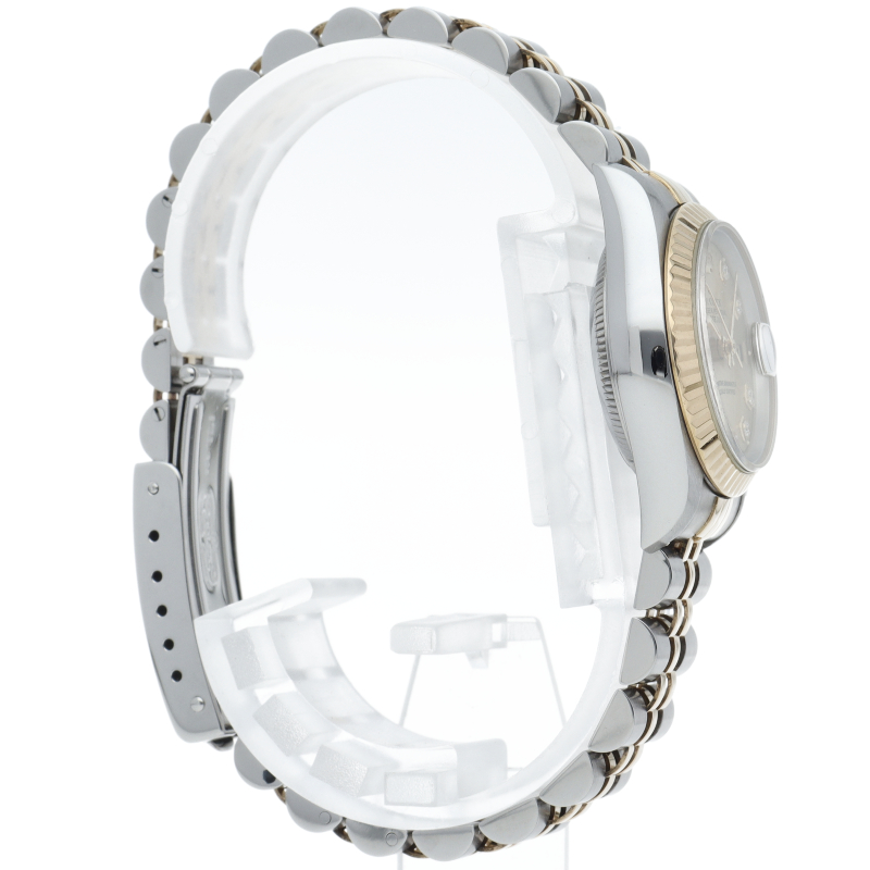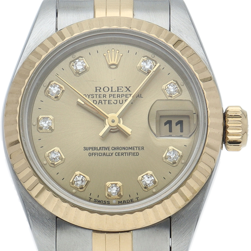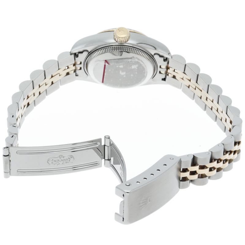 ロレックスのドレスウォッチで幅広い年齢層に愛されているデイトジャスト。イエローゴールドとステンレスのコンビ仕様に10Pダイヤが施され豪華です。
