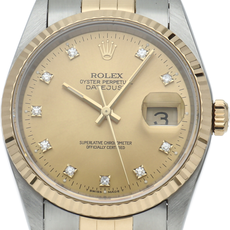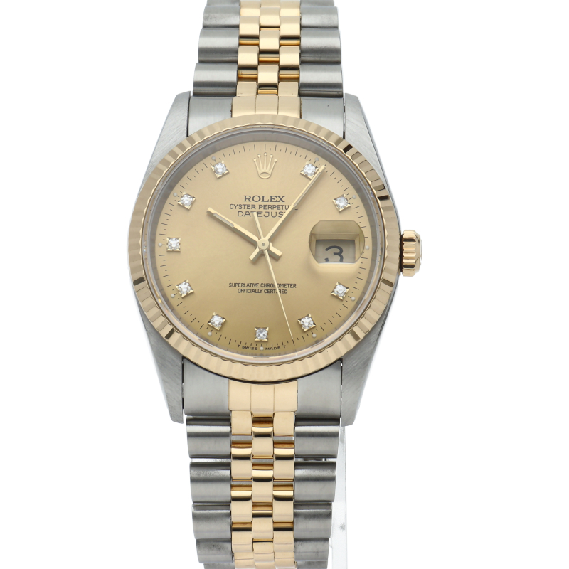 ロレックスのドレスウォッチの王道「デイトジャスト」。イエローゴールドとステンレスの組み合わせが上品で高級感を感じさせる1本です。