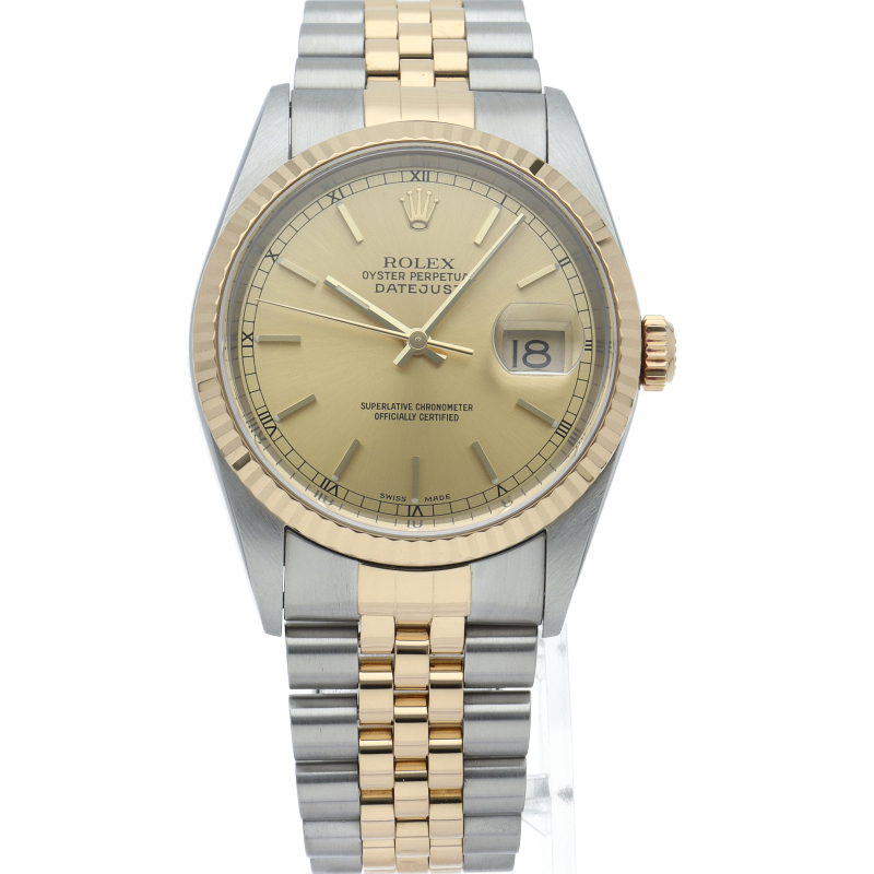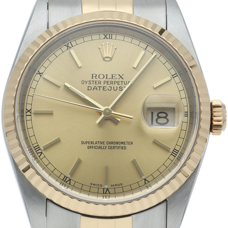 ロレックスのドレスウォッチの王道「デイトジャスト」。イエローゴールドとステンレスの組み合わせが上品で高級感を感じさせる1本です。