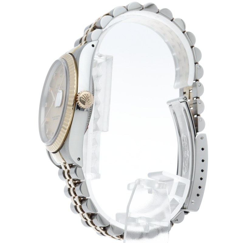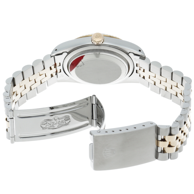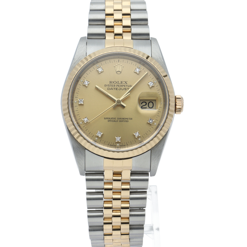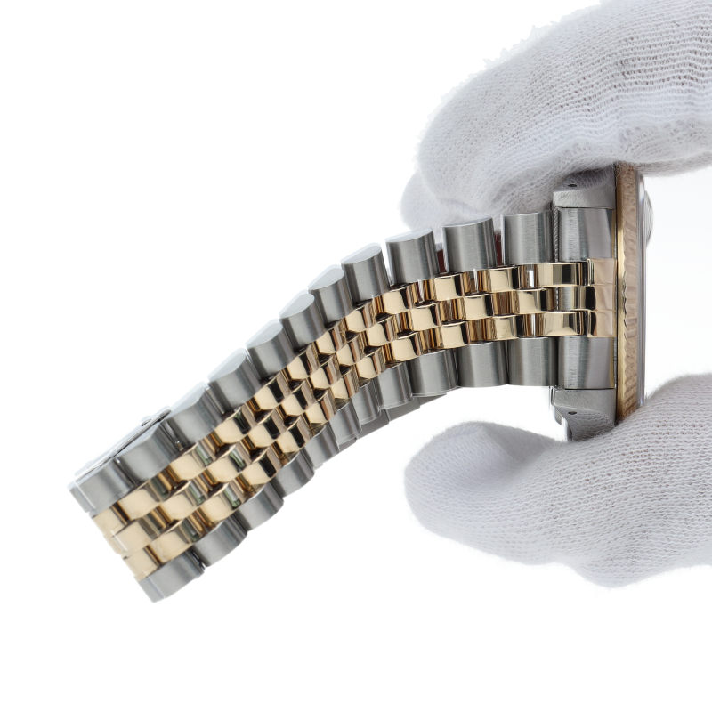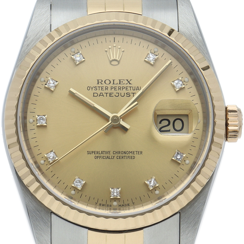 ロレックスのドレスウォッチで幅広い年齢層に愛されている「デイトジャスト」。イエローゴールドとステンレスのコンビ仕様に10Pダイヤが施されております。