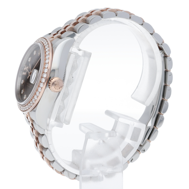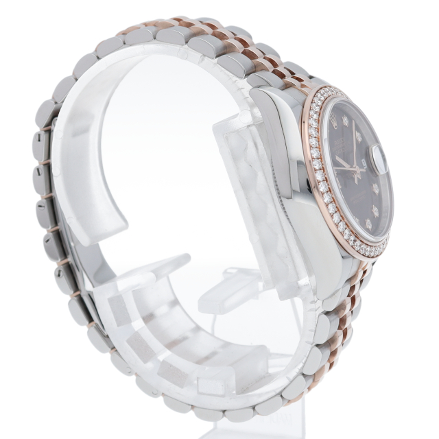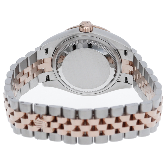 レディース・ロレックスの定番モデルとも言える「デイトジャスト」。こちらはスチールとエバーローズゴールドのコンビモデルで、ベゼルにセッティングされたダイヤモンドの煌きが美しいモデルです。ロレックスが特許を取得したシリコン製シロシキ・ヘアスプリングを備えたCal.2236を搭載。パワーリザーブは約55時間です。