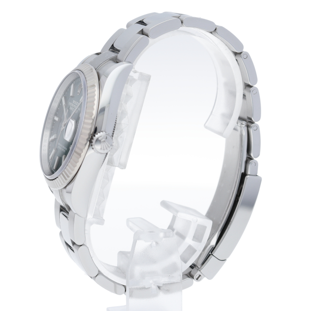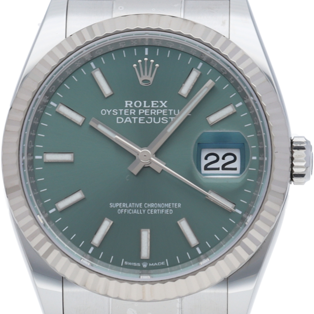 ロレックスを代表するドレスウォッチのデイトジャスト。こちらは2019年に発売。ロレックスによる完全自社製造ムーブメント「Cal.3235」が搭載されました。従来のロレックスムーブメントの約倍となる70時間のロングパワーリザーブを誇ります。ホワイトゴールドとステンレスのコンビ仕様にミントグリーン文字盤が装備されております。