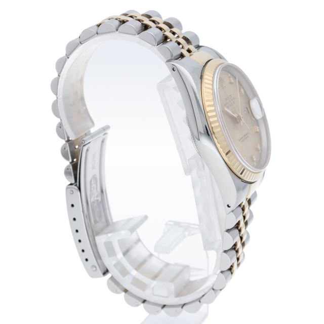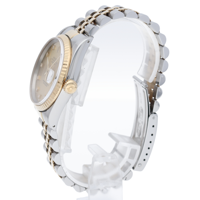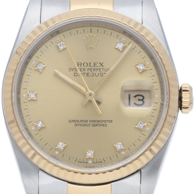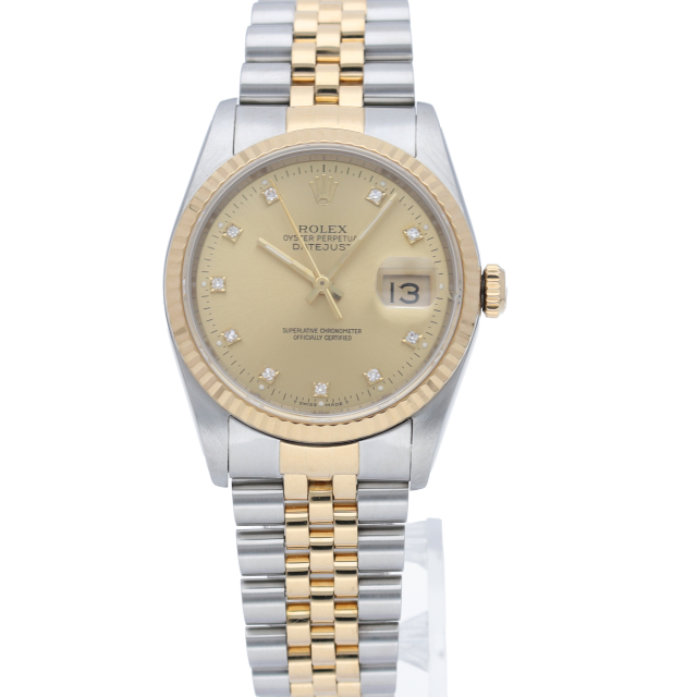 ロレックスのドレスウォッチで幅広い年齢層に愛されている「デイトジャスト」。イエローゴールドとステンレスのコンビ仕様に10Pダイヤが施されております。