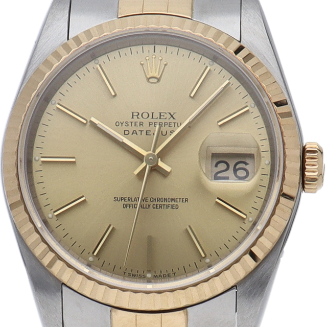 ロレックスのドレスウォッチの王道「デイトジャスト」。イエローゴールドとステンレスの組み合わせが上品で高級感を感じさせる1本です。
