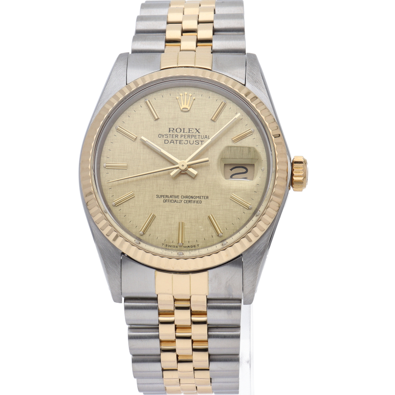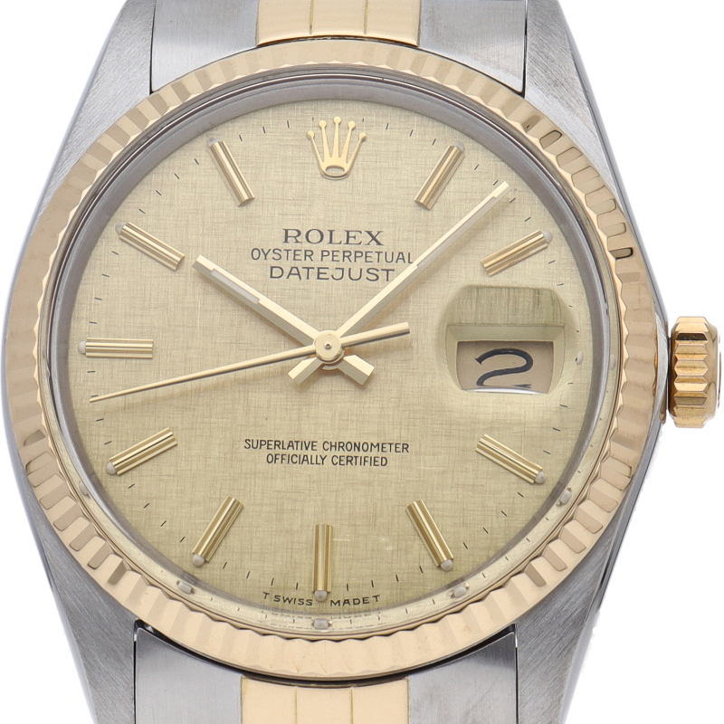ロレックスのドレスウォッチの王道「デイトジャスト」。イエローゴールドとステンレスの組み合わせが上品で高級感を感じさせる1本です。