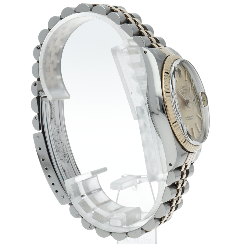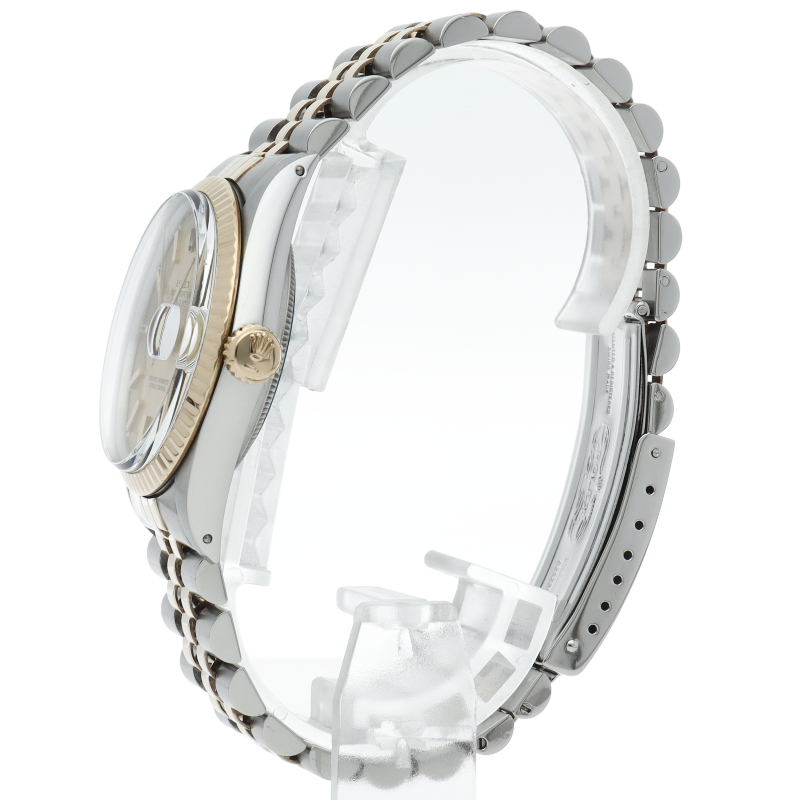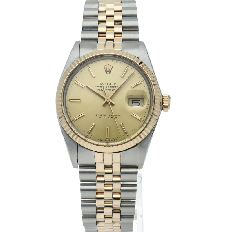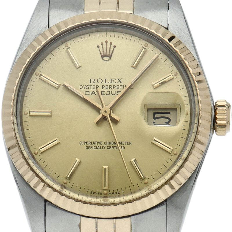 ロレックスドレスウォッチの王道「デイトジャスト」。イエローゴールドとステンレスの組み合わせが高級感を感じさせる1本です。プラスチック風防仕様。