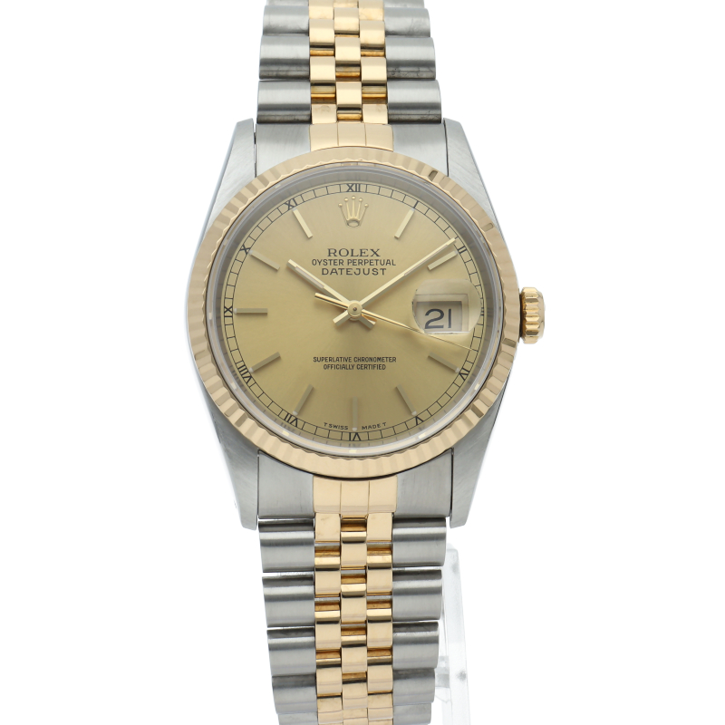 ロレックスのドレスウォッチの王道「デイトジャスト」。イエローゴールドとステンレスの組み合わせが上品で高級感を感じさせる1本です。