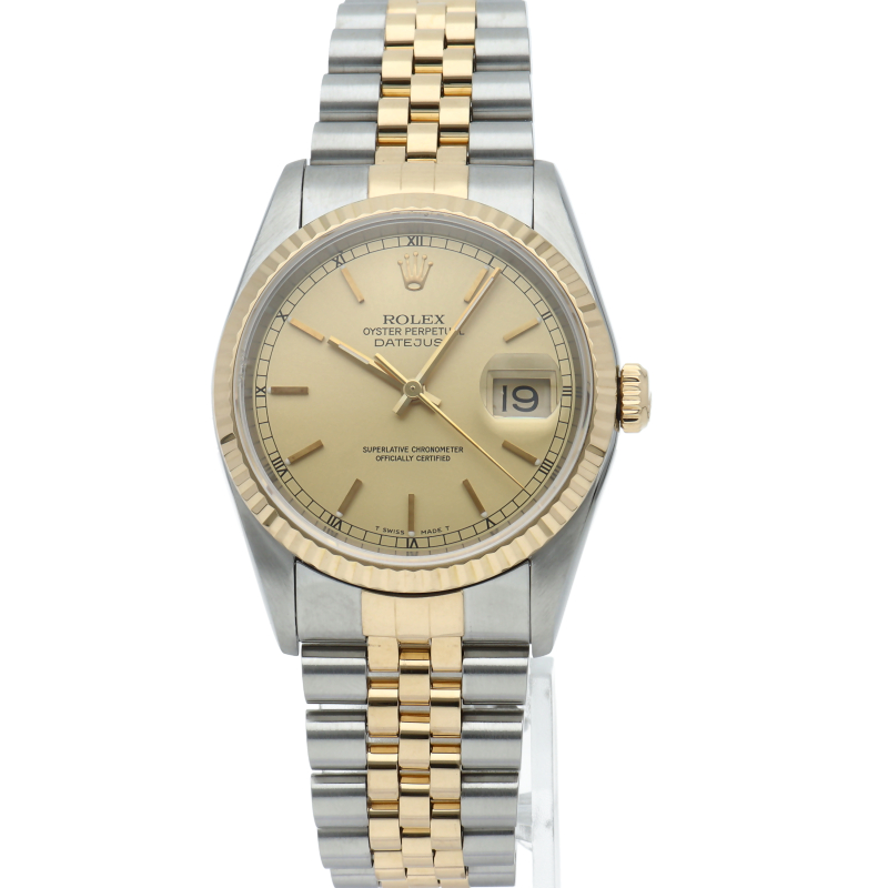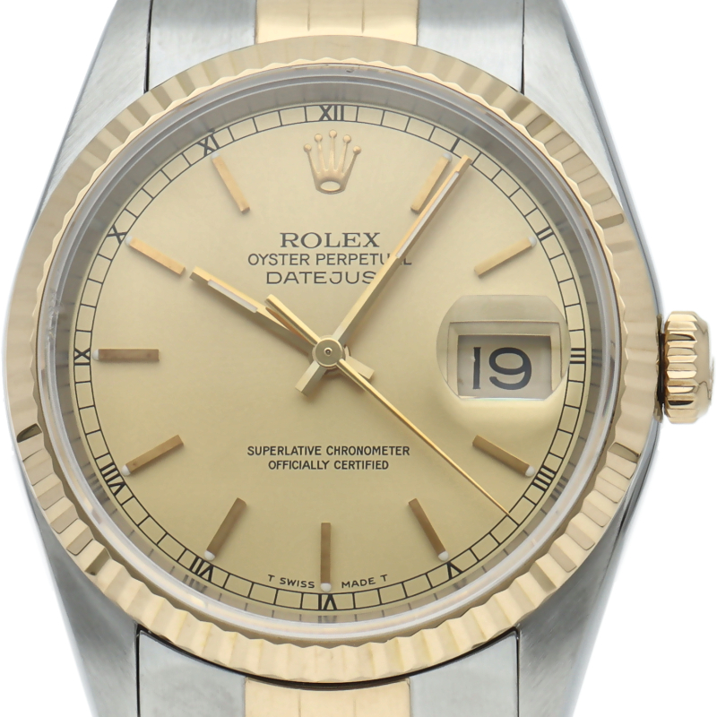 ロレックスのドレスウォッチの王道「デイトジャスト」。イエローゴールドとステンレスの組み合わせが上品で高級感を感じさせる1本です。