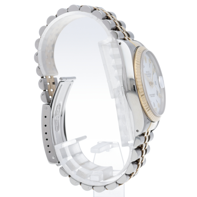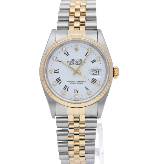 ロレックスのドレスウォッチで幅広い年齢層に愛されている「デイトジャスト」。インデックスは小さなローマ数字と、その外側にダイヤモンドをセッティングしているデザインで、上品で華やかな文字盤に仕上がっています。あまり見かけない珍しいモデルです。