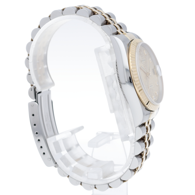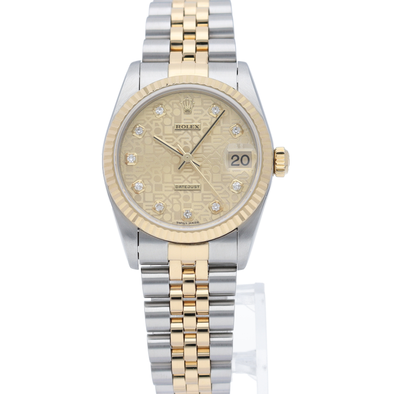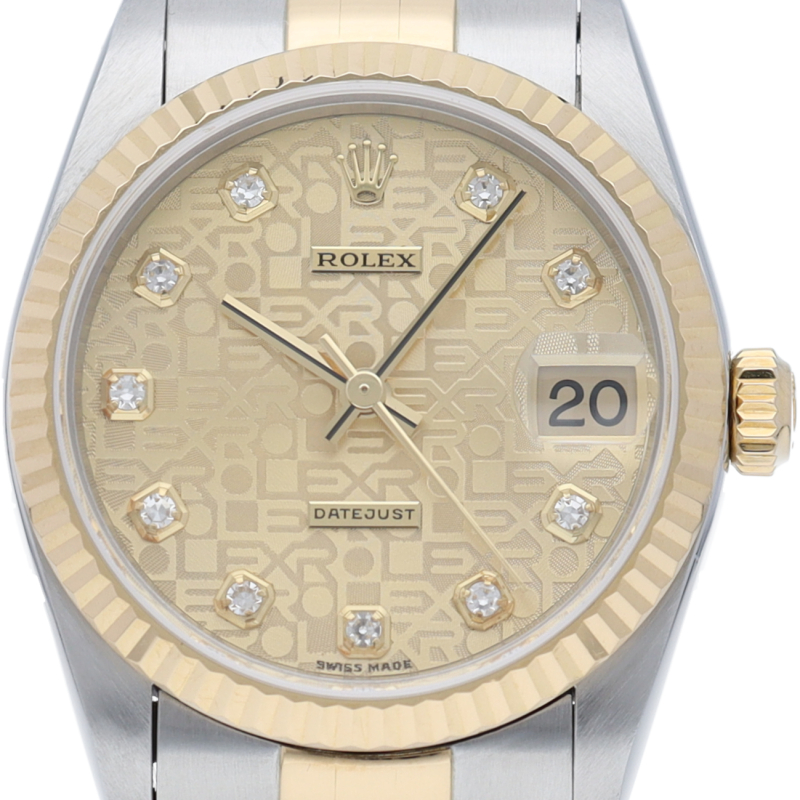 ロレックスのドレスウォッチで幅広い年齢層に愛されているデイトジャスト。イエローゴールドとステンレスのコンビ仕様に10Pダイヤが施されております。ボーイズサイズ。