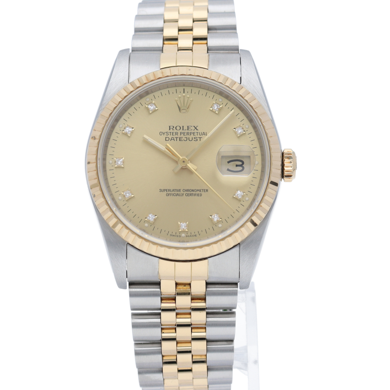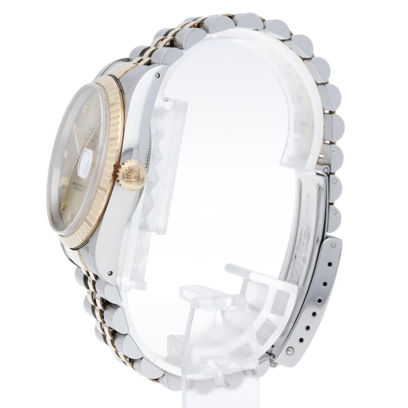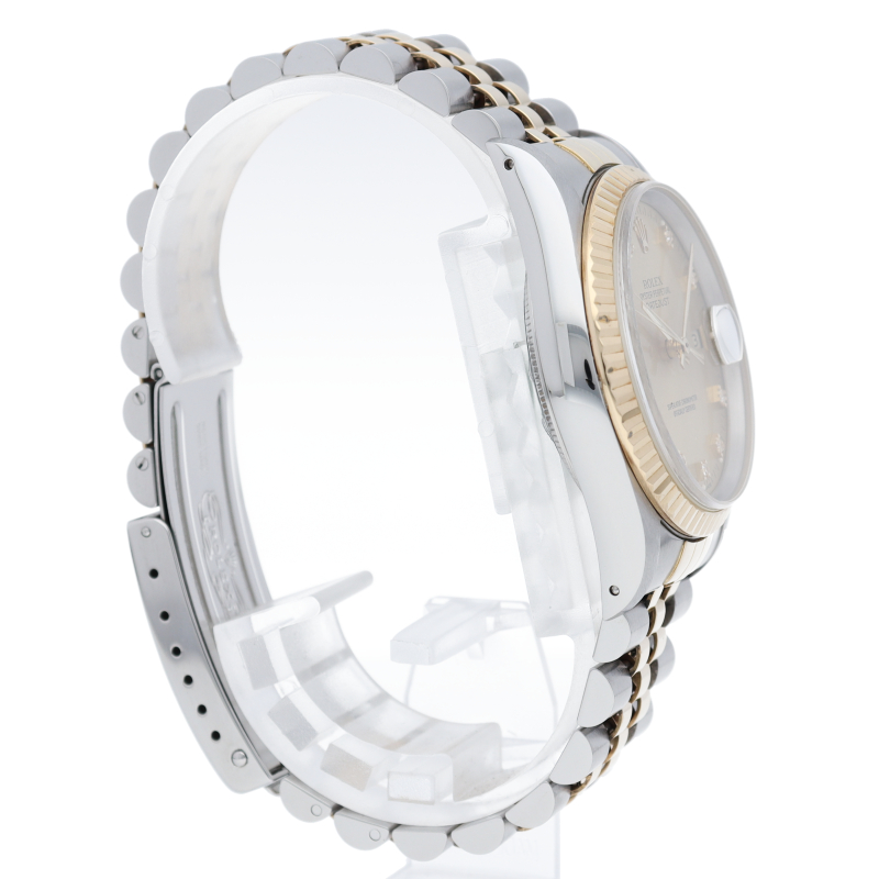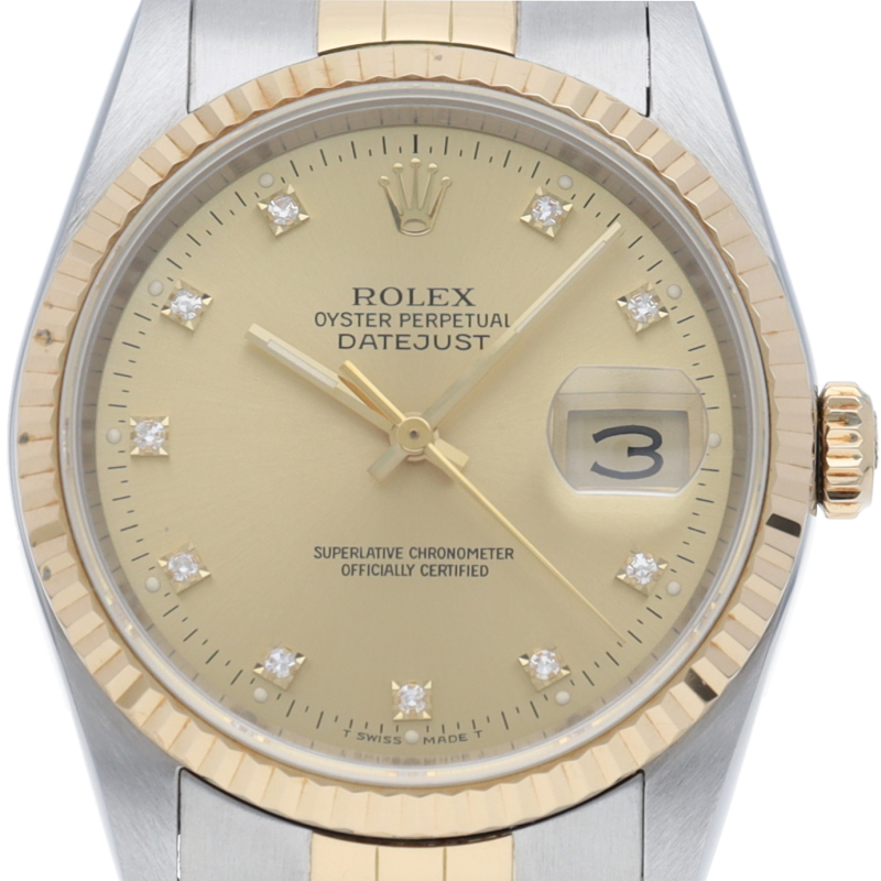 ロレックスのドレスウォッチで幅広い年齢層に愛されている「デイトジャスト」。インデックスは小さなローマ数字と、その外側にダイヤモンドをセッティングしているデザインで、上品で華やかな文字盤に仕上がっています。あまり見かけない珍しいモデルです。