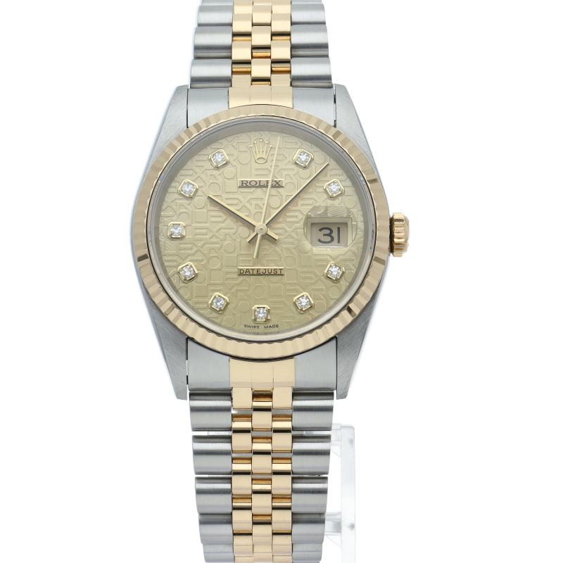ロレックスのドレスウォッチの王道「デイトジャスト」。イエローゴールドとステンレスの組み合わせが上品で高級感を感じさせる1本です。