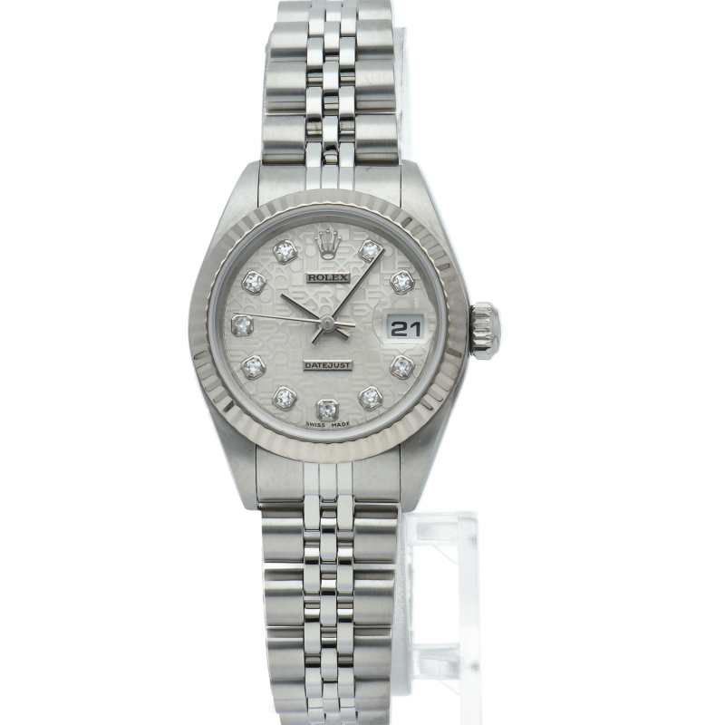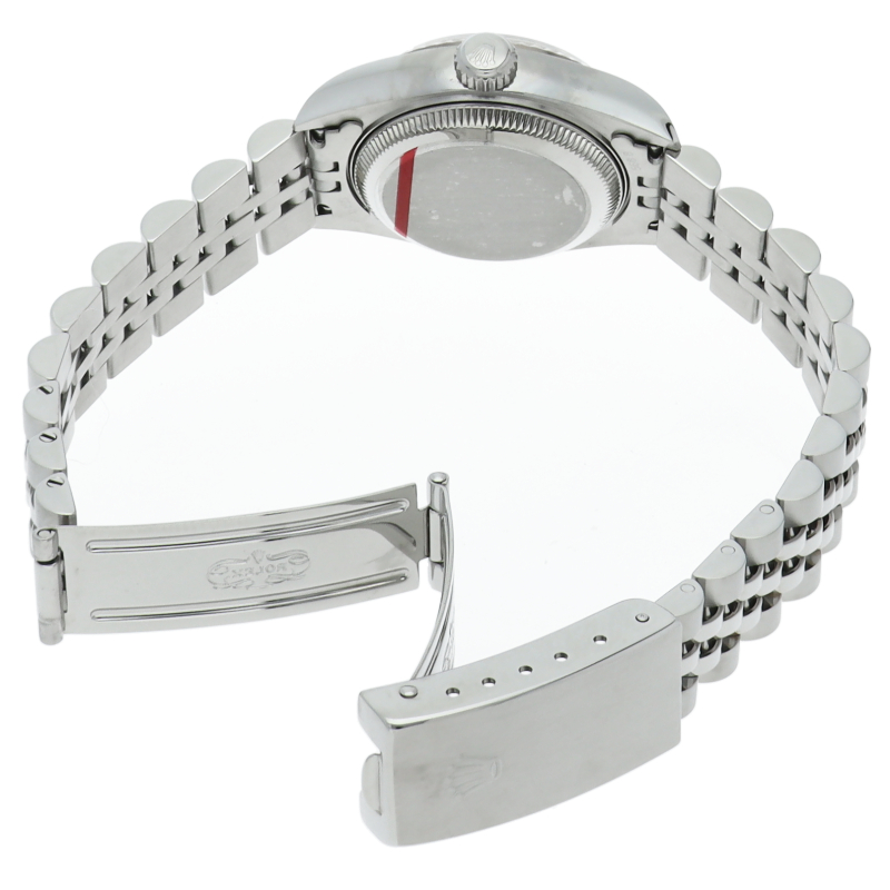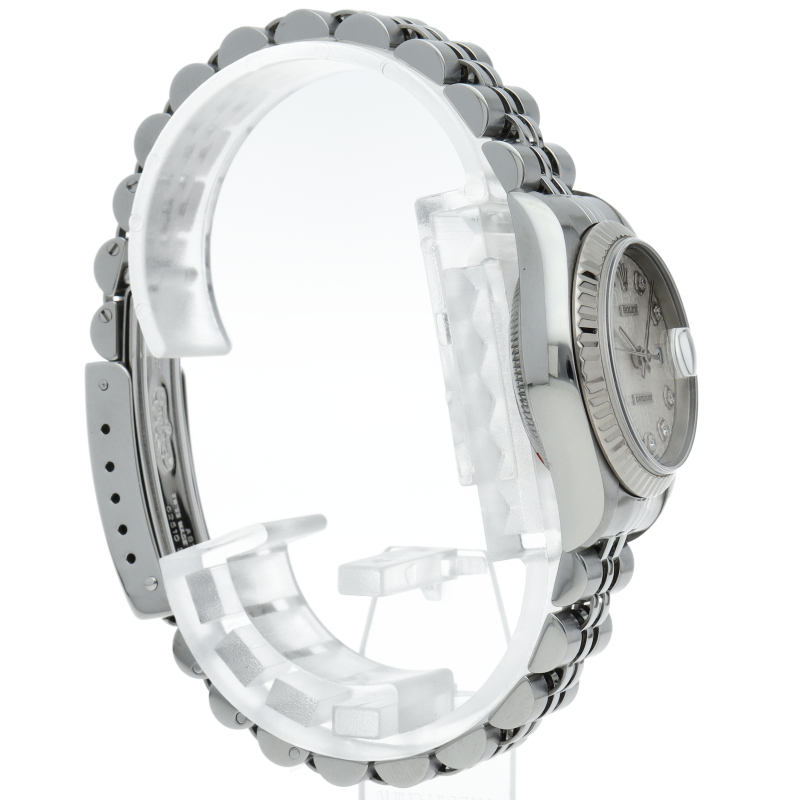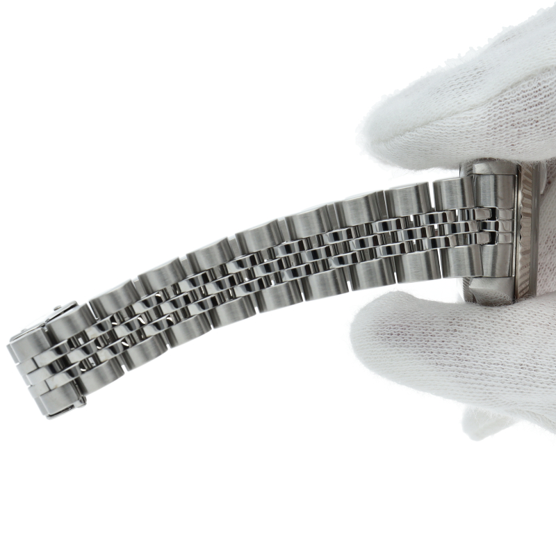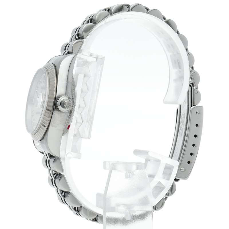 2000年頃の個体で、癖のないステンレスケースにホワイトゴールド製のフルーテッドベゼルを備えることで、文字盤とダイヤをより高貴な印象に。ダイヤが派手に感じる方もいらっしゃると思いますが、レディースの小ぶりなケースから放たれるダイヤの輝きには嫌味な印象は無く、程良いアクセントになっております。ケース径は26mmと女性の腕元にスッキリと納まり、洗練された大人の雰囲気を演出できると思います。