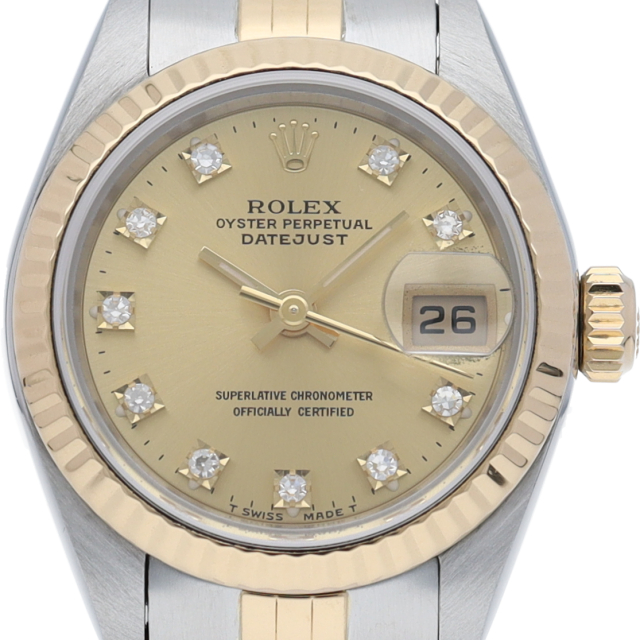 ロレックスのドレスウォッチで幅広い年齢層に愛されているデイトジャスト。イエローゴールドとステンレスのコンビ仕様に10Pダイヤが施され豪華です。
