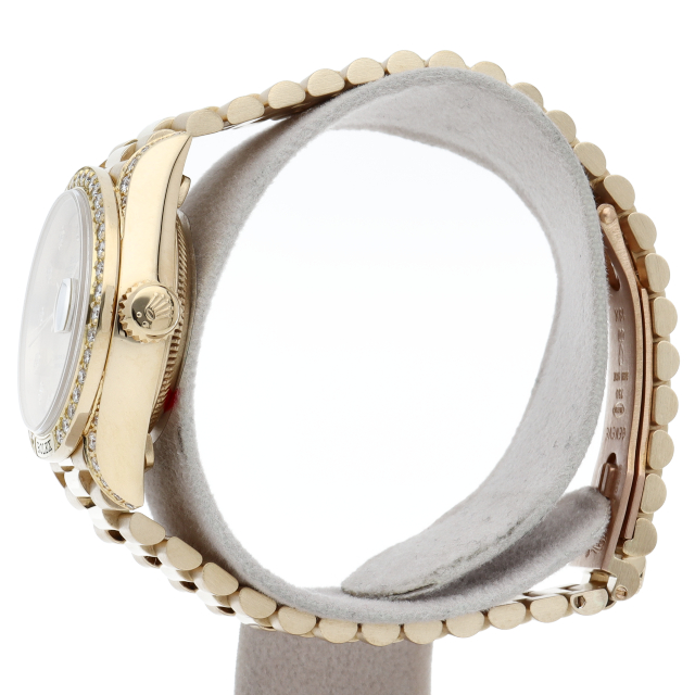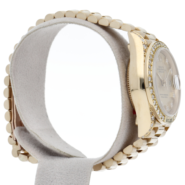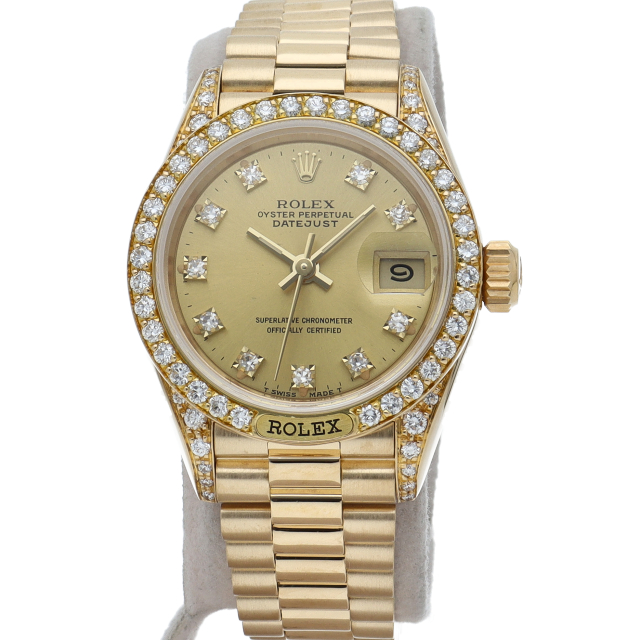 ロレックスのドレスウォッチで幅広い年齢層に愛されているデイトジャスト。イエローゴールドのケースにダイヤ付きベゼル・ラグ、シャンパン文字盤にも10Pダイヤが施され豪華です。
