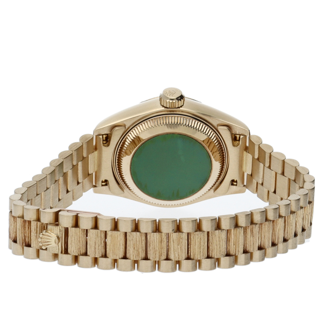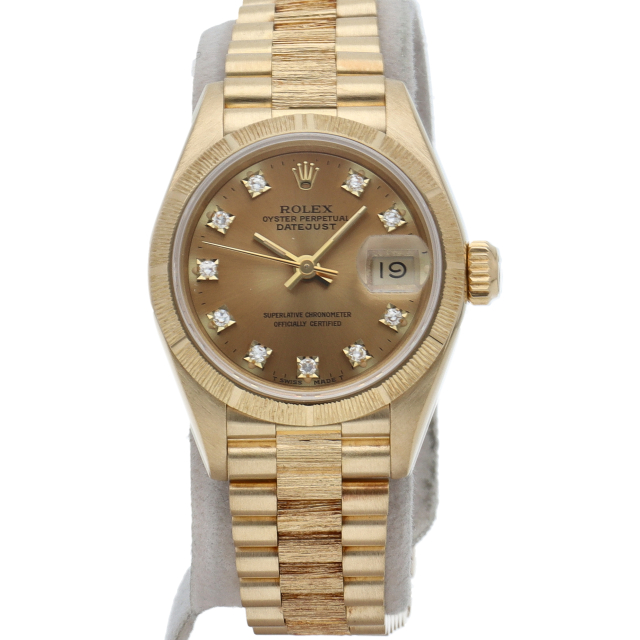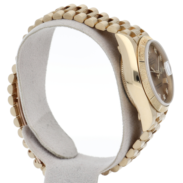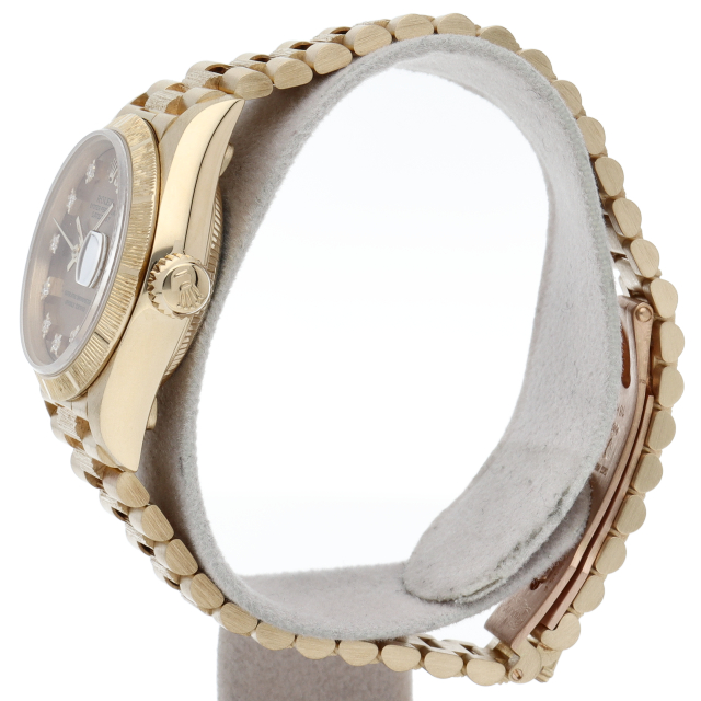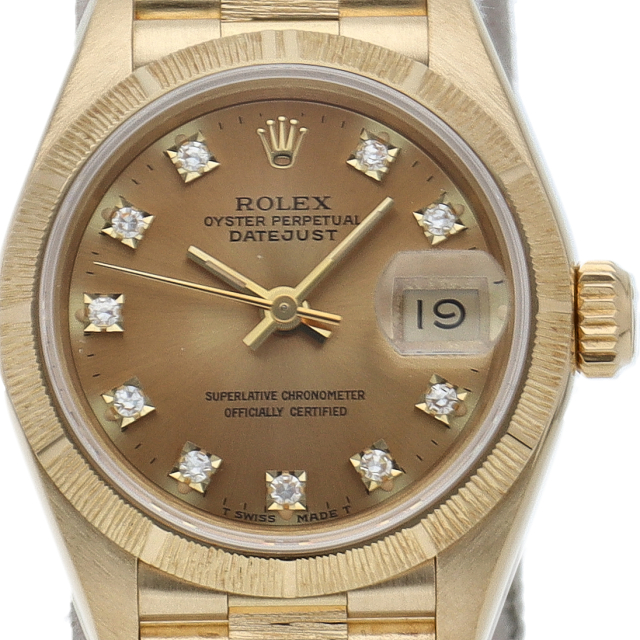 ロレックスのドレスウォッチで幅広い年齢層に愛されているデイトジャスト。イエローゴールドのケース、ゴールド文字盤に10個のダイヤが施された豪華な1本です、