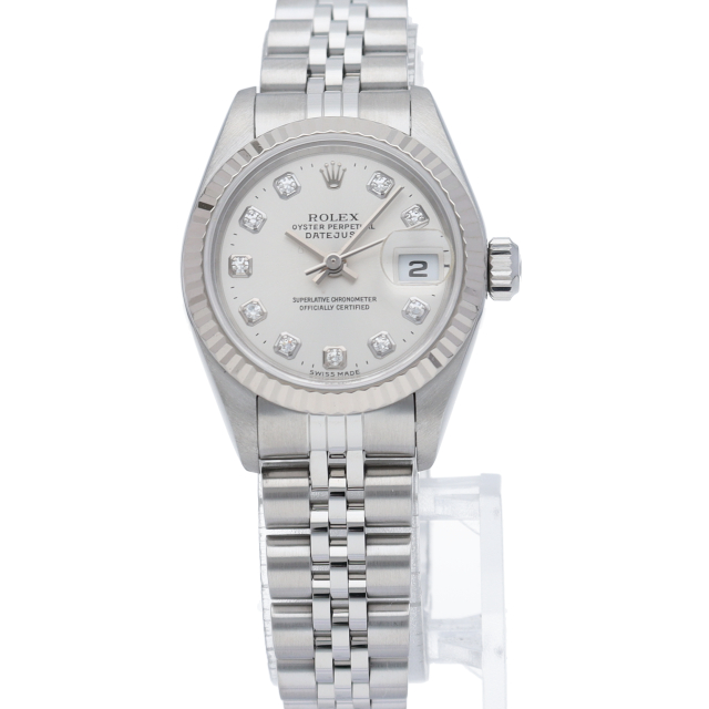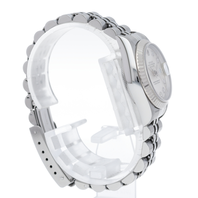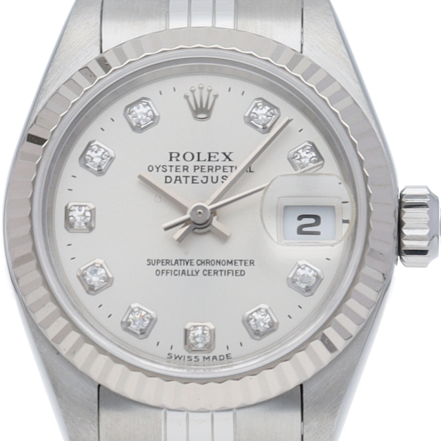 ロレックスのドレスウォッチで幅広い年齢層に愛されているデイトジャスト。ホワイトゴールドとステンレスのコンビ仕様に10Pダイヤが施され豪華です。
