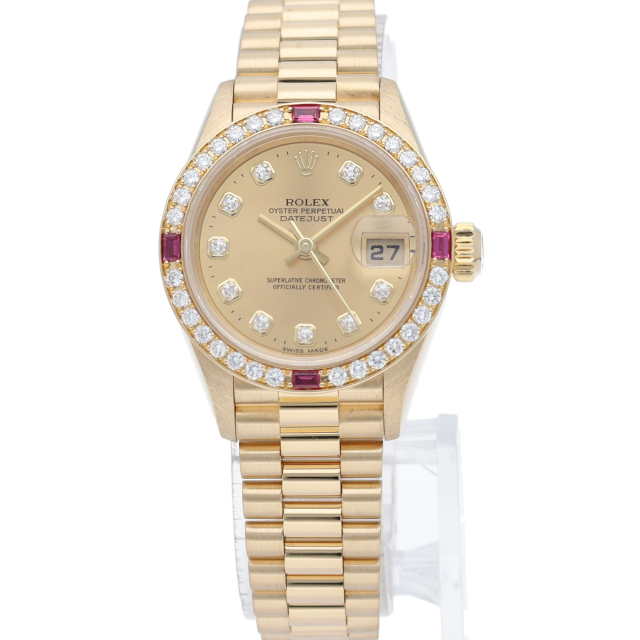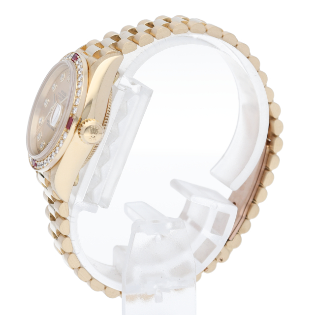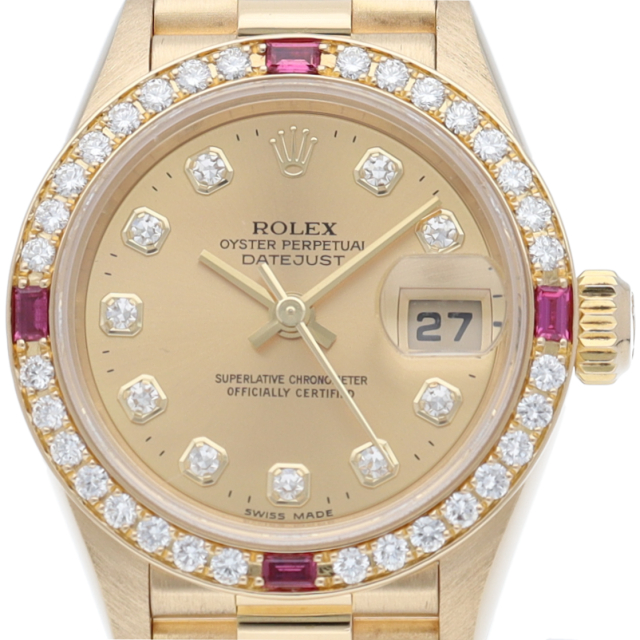 ロレックスのドレスウォッチで幅広い年齢層に愛されているデイトジャスト。こちらはベゼルにはダイヤモンドとルビーを使用し、インデックスにも10Pダイヤを使用したゴージャスなモデルです。