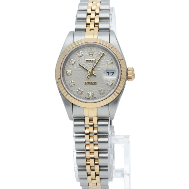 ロレックスのドレスウォッチで幅広い年齢層に愛されている「デイトジャスト」。イエローゴールドとステンレスのコンビ仕様に10Pダイヤが施され豪華です。