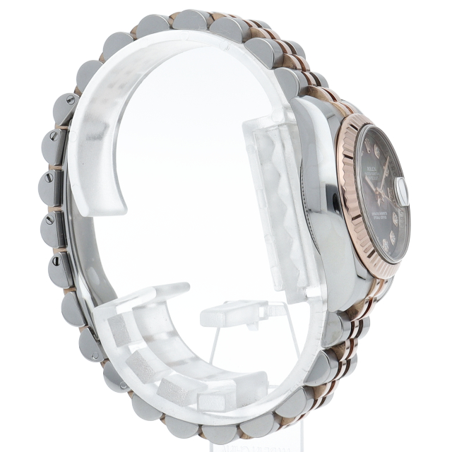 1945年にリリースされ、今やロレックスの顔とも言える“デイトジャスト”は、金属塊から削りだした防水性の高いオイスターケース、午前0時頃瞬時に日付けが変わるデイトジャスト機構、全回転式ローターを搭載したパーペチュアル機構と、ロレックスの三大機構を搭載したモデルです。更に10Pダイヤが施された高級感溢れる1本。
