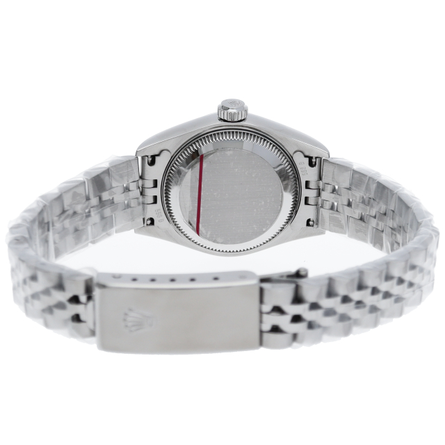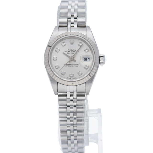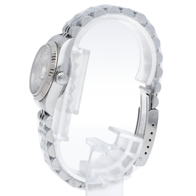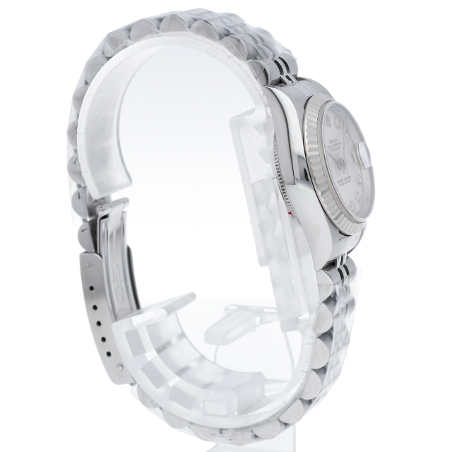 2000年頃の個体で、癖のないステンレスケースにホワイトゴールド製のフルーテッドベゼルを備えることで、文字盤とダイヤをより高貴な印象に。ダイヤが派手に感じる方もいらっしゃると思いますが、レディースの小ぶりなケースから放たれるダイヤの輝きには嫌味な印象は無く、程良いアクセントになっております。ケース径は26mmと女性の腕元にスッキリと納まり、洗練された大人の雰囲気を演出できると思います。