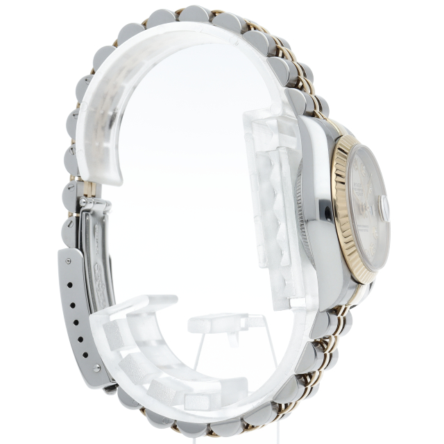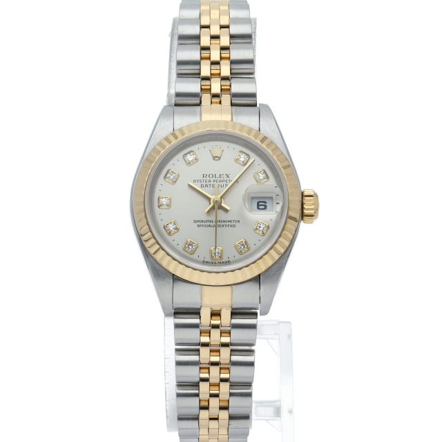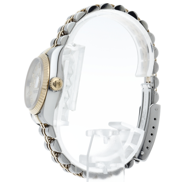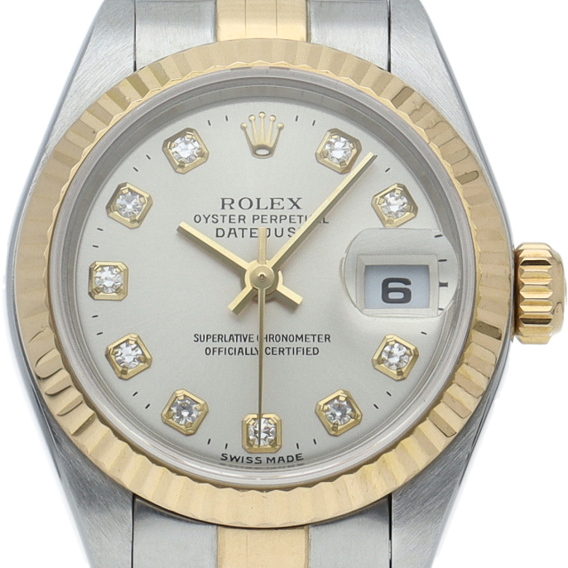 ロレックスのドレスウォッチで幅広い年齢層に愛されている「デイトジャスト」。イエローゴールドとステンレスのコンビ仕様に10Pダイヤが施され豪華です。