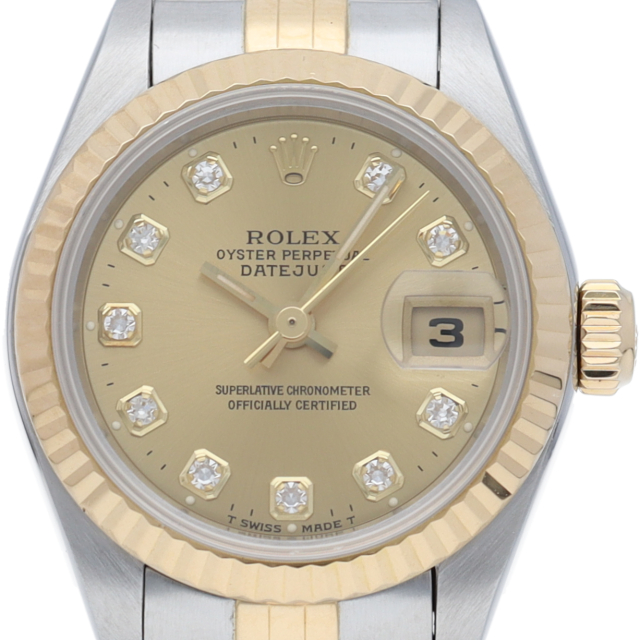 ロレックスの人気ドレスウォッチで幅広年齢層に人気のデイトジャスト。イエローゴールドとステンレスのコンビ仕様に10Pダイヤが施されてます。