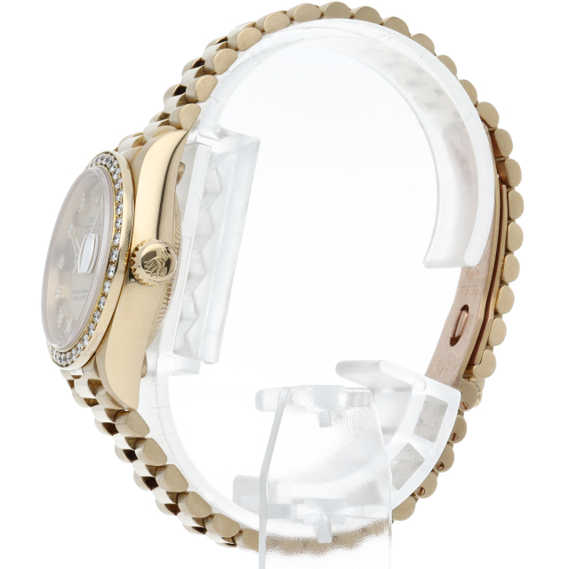 ロレックスのドレスウォッチで幅広い年齢層に愛されているデイトジャスト。イエローゴールドのケース、ゴールド文字盤に10個、ベゼルに40個のダイヤが施された豪華な1本です、