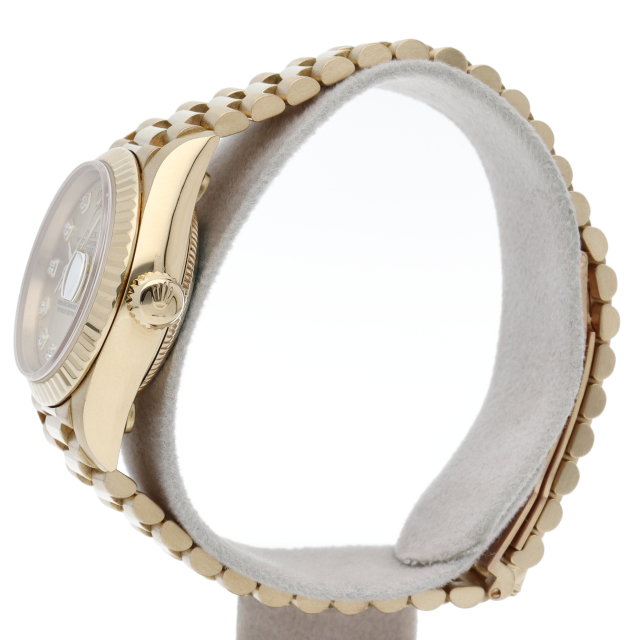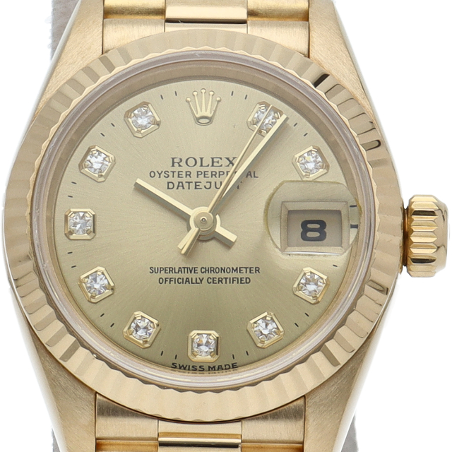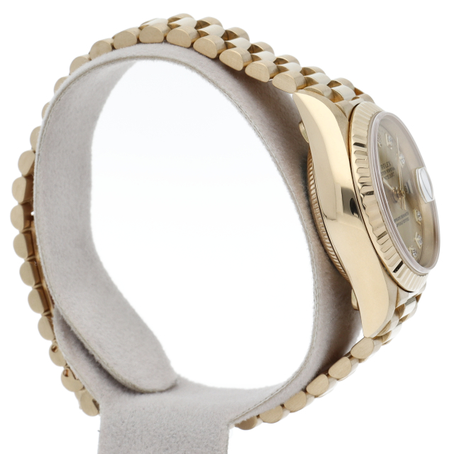 ロレックスのドレスウォッチで幅広い年齢層に愛されているデイトジャスト。イエローゴールドのケース、シャンパン文字盤に10Pダイヤが施され豪華です。