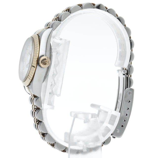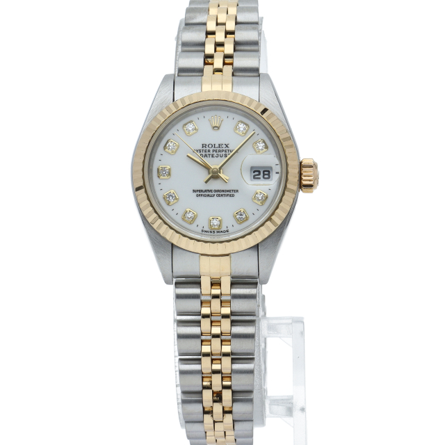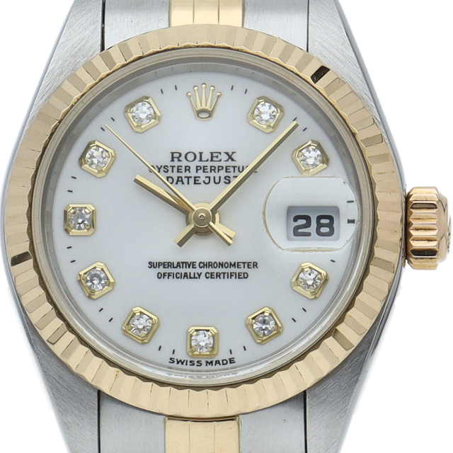 ロレックスのドレスウォッチで幅広い年齢層に愛されている「デイトジャスト」。イエローゴールドとステンレスのコンビ仕様に10Pダイヤが施され豪華です。