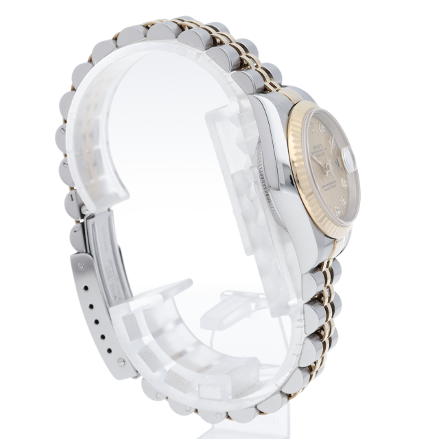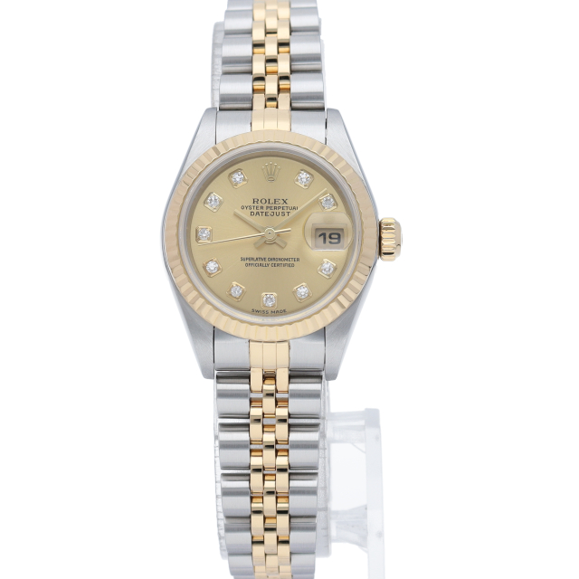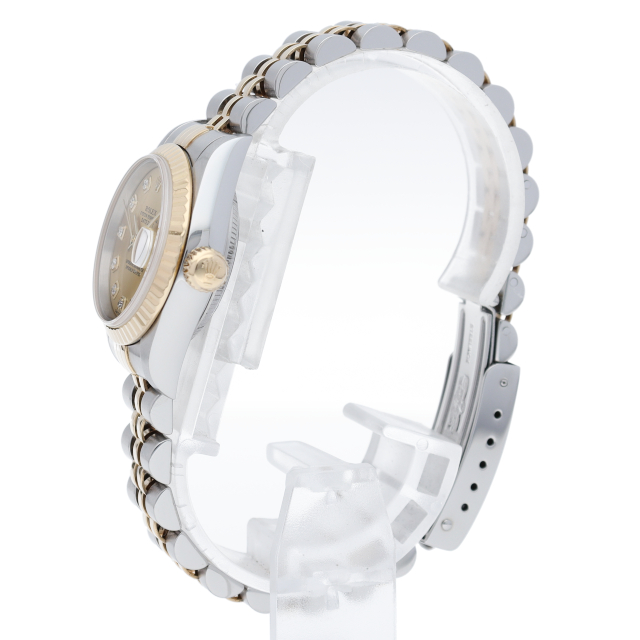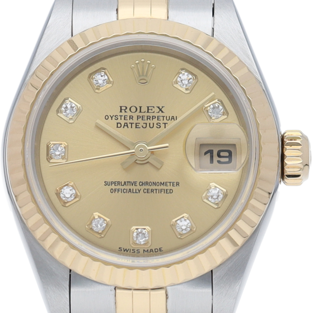 ロレックスのドレスウォッチで幅広い年齢層に愛されている「デイトジャスト」。イエローゴールドとステンレスのコンビ仕様に10Pダイヤが施され豪華です。