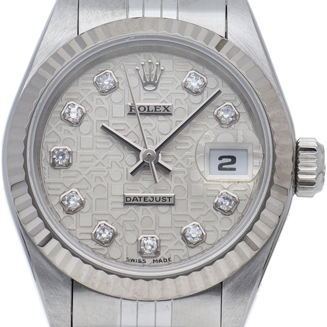 ロレックスのドレスウォッチで幅広い年齢層に愛されているデイトジャスト。ホワイトゴールドとステンレスのコンビ仕様に10Pダイヤが施され豪華です。