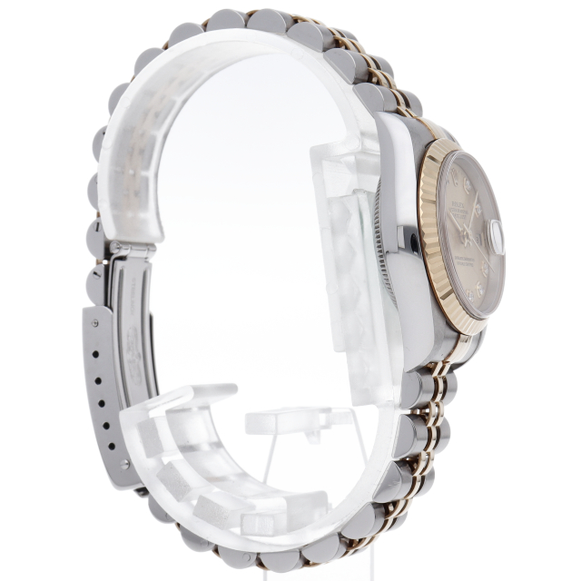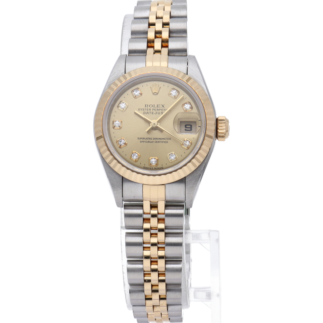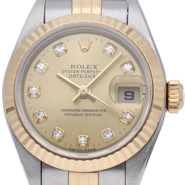 ロレックスのドレスウォッチで幅広い年齢層に愛されている「デイトジャスト」。イエローゴールドとステンレスのコンビ仕様に10Pダイヤが施され豪華です。