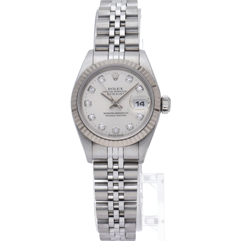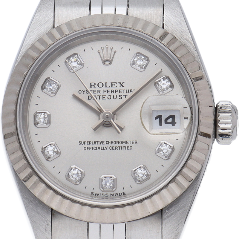 ロレックスのドレスウォッチで幅広い年齢層に愛されているデイトジャスト。ホワイトゴールドとステンレスのコンビ仕様に10Pダイヤが施され豪華です。